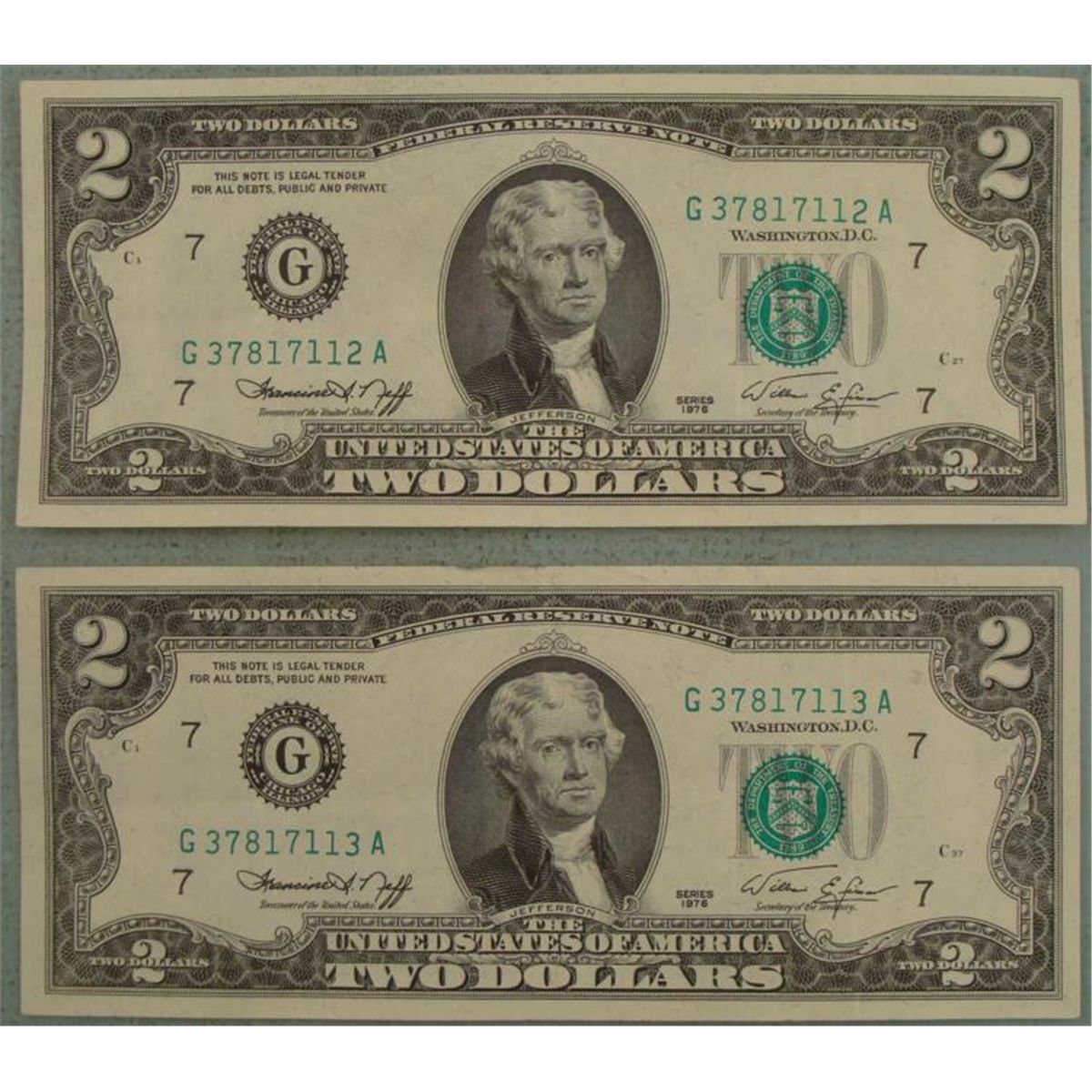 (2) 1976 $2 notes with consecutive serial numbers * Mint mark: G (Chicago)Condition: Uncirculated