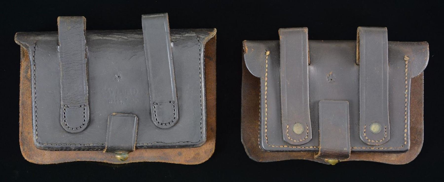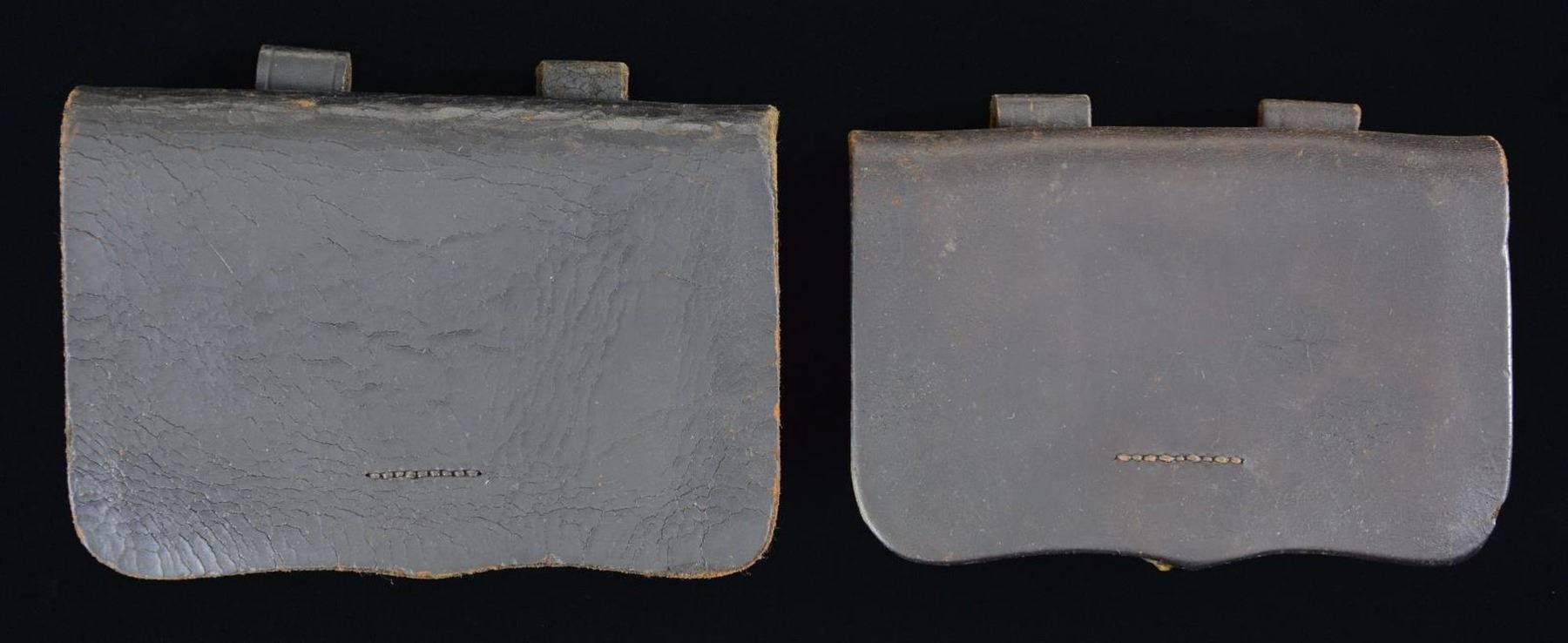 BOXES PICTURED IN "U.S. MILITARY HOLSTERS AND RELATED ACCOUTREMENTS" BY SCOTT EDWARD MEADOWS. These cartridge boxes are made of black leather with brass stud for retention with 2 belt loops. Interior of boxes has additional leather divider. 1) EARLY REGULATION BY EMERSON GAYLORD OF CHICOPEE MASS. Measuring approx. 6" x 4.5" overall. 2) Measuring approx. 5.75" x 4.25" appearing unmarked. CONDITION: cartridges are good intact with considerable flexing & cracking of leather. PROVENANCE: The Collection of Edward Scott Meadows. (02-22155/MD). $200-400.