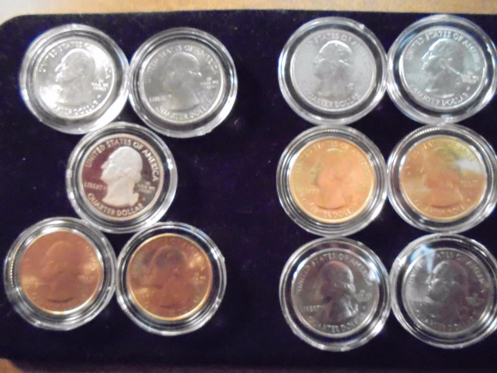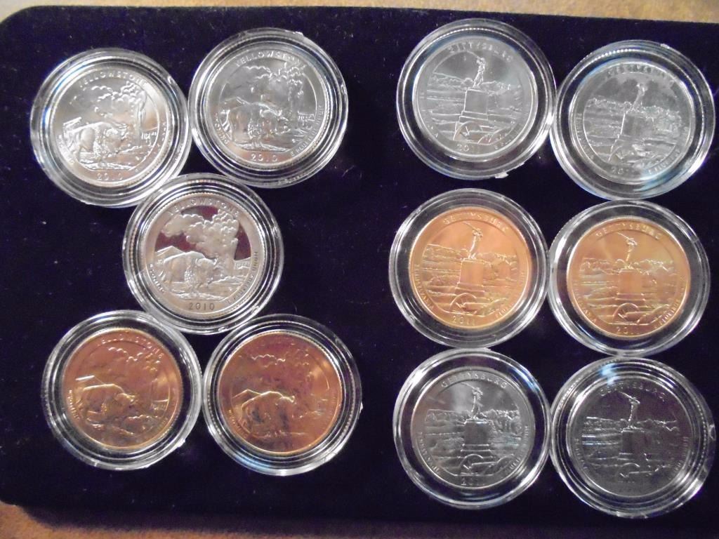 2010 YELLOWSTONE P & D UNC, S PROOF AND P & D GOLD PLATED UNC AND 2011 GETTYSBURG P & D UNC, P & D GOLD PLATED AND P & D PLATINUM PLATED