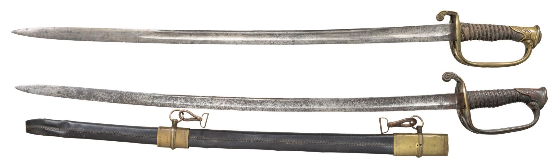 1) An example of a French import US M1850 style Foot officer's sword measuring 36 1/2" overall with a 30 1/2" etched blade. The etching on the blade includes various foliate motifs along with some generic military motifs. Gilded brass hilt with a pierced foliate decorated guard. Wire wrapped sharkskin grip. No scabbard. CONDITION: blade has a medium gray mottled patina. hilt has a mellow patina with only a trace of gilded finish remaining. Quillon is bent downward. Wire and grip are worn but complete. 2) An example of a German import US M1850 style Foot officer's sword measuring 36 1/4" overall with a 30 1/2" etched blade stamped "H S" in a logo on the ricasso. The etching on the blade includes various foliate motifs along with American patriotic and military motifs. Gilded brass hilt with a pierced foliate decorated guard. Wire wrapped wooden grip. Partial gilded brass mounted leather scabbard. CONDITION: blade has a medium gray mottled patina. Hilt has a deep mellow patina with only traces of gilded finish remaining. Wire and grip are worn with no leather remaining. The scabbard appears to have the top 2 original mounts but the leather is an old replacement. No drag. (02-24169/BF). NON-GUN. $400-600.