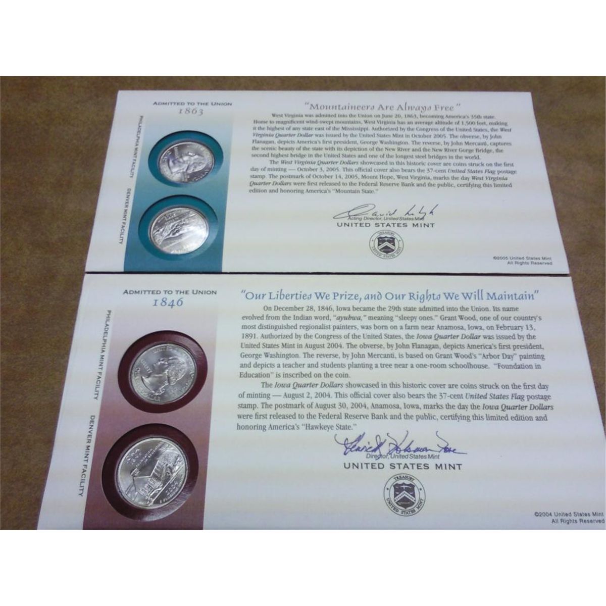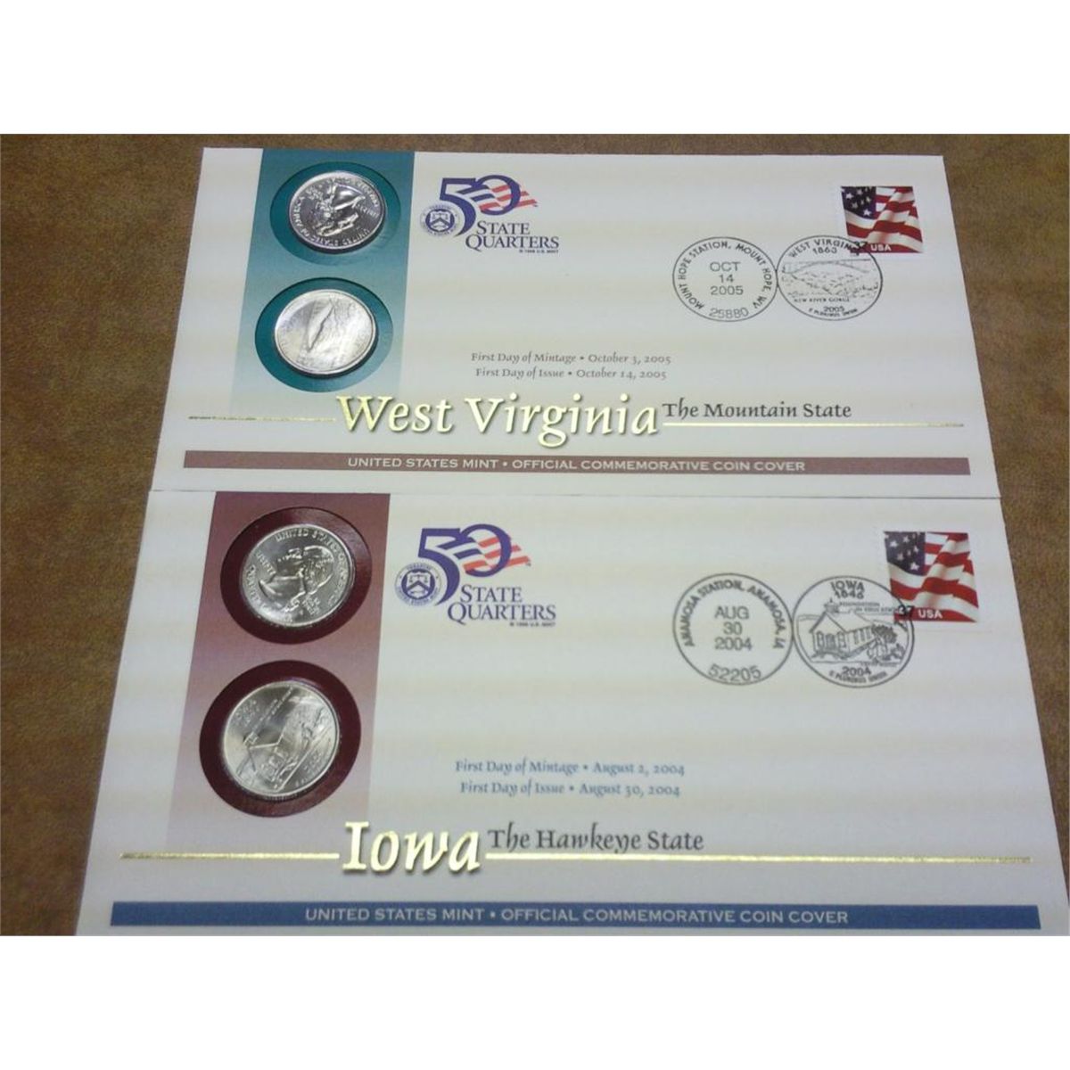 2 US MINT STATE QUARTER FDC'S, IOWA, WEST VIRGINIA