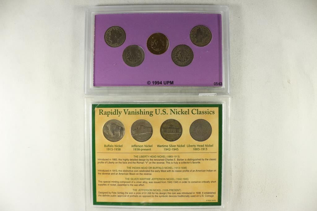 CONTAINS: 5-LIBERTY "V" NICKELS, 2ND SET IS AMERICAN NICKELS OF THE 20TH CENTURY CONTAINS: LIBERTY "V" NICKEL, BUFFALO NICKEL, 35% SILVER JEFFERSON WAR NICKEL AND JEFFERSON NICKEL