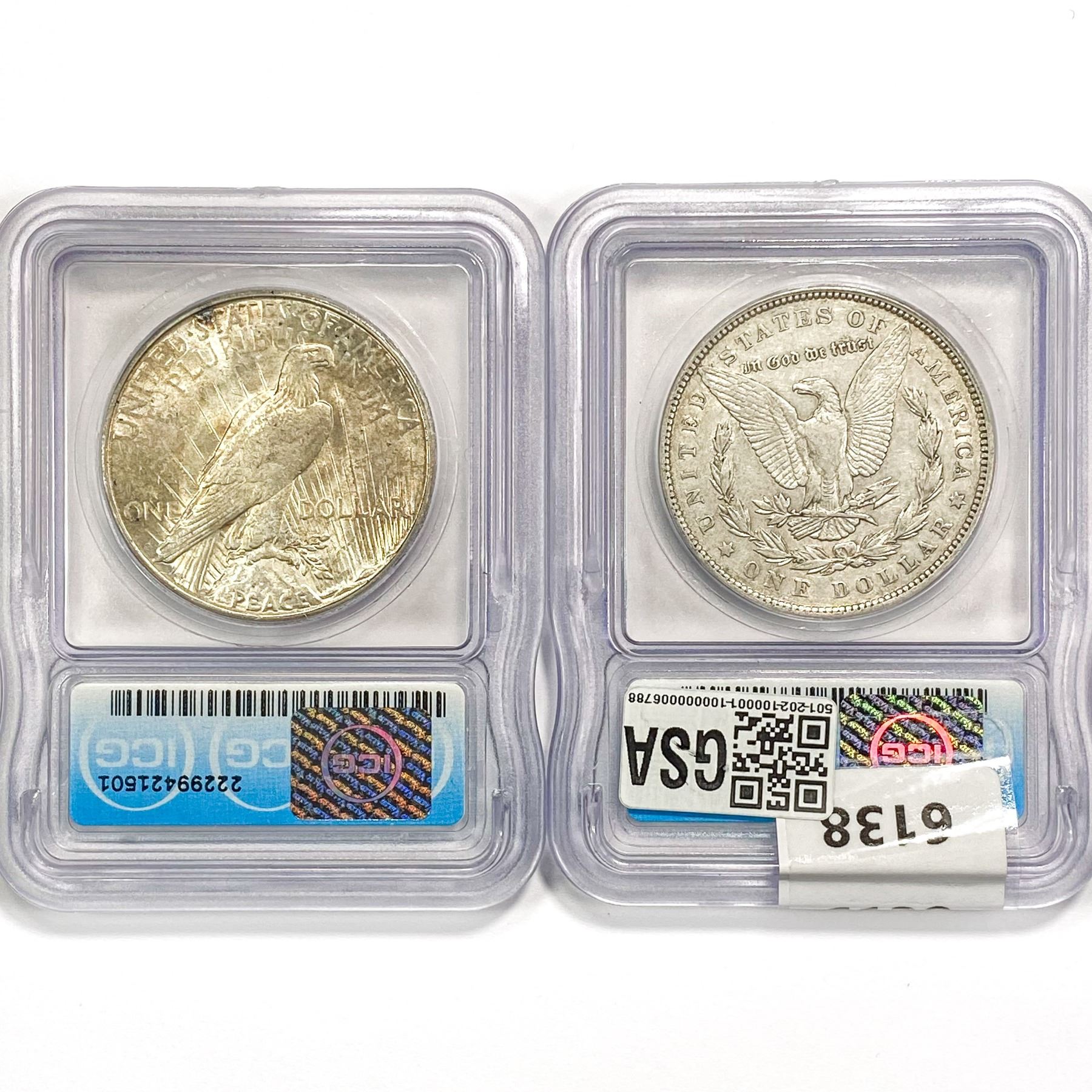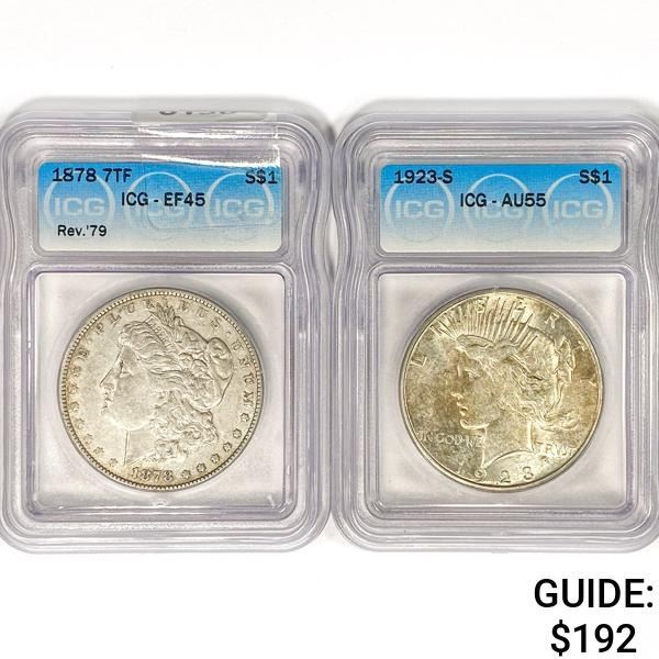 (2) US Silver Dollars ICG (1878 7TF Rev 79, 1923-