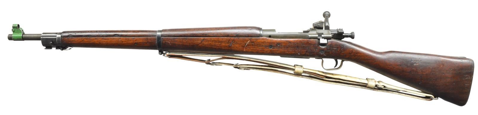 RIFLES. 1) Cal. 30-06. S# 3959684. Bbl. 24" marked behind front sight “RA”, flaming bomb & “7-43”. All visible parts marked “R”. Adj. aperture rear sight. Blade front sight w/ snap on sheet metal cover which is painted green. All stamped furniture including lg. bow trigger guard & fine, checkered buttplate. Walnut stock set w/ 2 recoil bolts. Marked w/ very faint “FJA” over trigger guard on left side & circle “P” proof under grip w/ 4 inspectors marks forward of trigger guard. UNATTACHED ACCESSORIES: white painted, military style leather sling w/ extensive cracking & wear. CONDITION: stock set has moderate wear, dents, staining & scratches throughout. Notable sm. gouges in cheek area. Handguard has 5" crack on top forward of receiver. Metal has 70% original finish w/ wear, scratches & sm. spots of oxidation. Painted muzzle cover has wear & flaking. Good, shiny 4-groove bore. (20-2974/RW). 2) Cal. 30-06. S# 3599799. Bbl. 24" marked behind front sight “RA”, flaming bomb & “8-34”. Adj. aperture rear sight. Blade front sight. All stamped furniture, except for milled trigger guard. Bolt marked underneath w/ “R”. Scalloped bolt sleeve marked “BP”. Cutoff marked “R”. Walnut stock set marked w/ boxed “SA” & “J” overhaul mark on left side of butt. Encircled “P” proof under grip. Marked “P” in cutout recess. CONDITION: arsenal refinish stock set has very nice appearance w/ light wear & scattered handling marks w/ crisp markings. Metal retains very lg. degree of arsenal rework parkerization w/ very light high point wear. Very good, shiny 2-groove bore. (20-2996/RW). BOTH CURIO. $700-1,000.