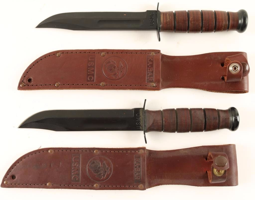 Stacked leather handle with leather scabbards.
