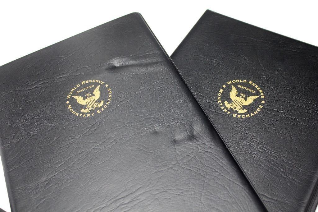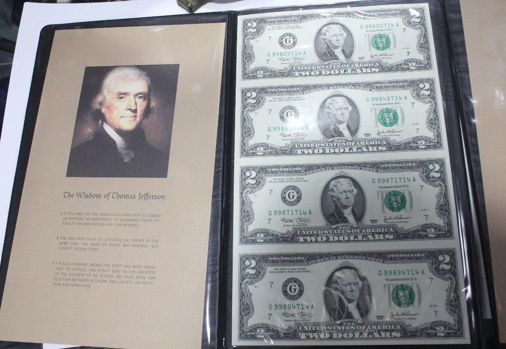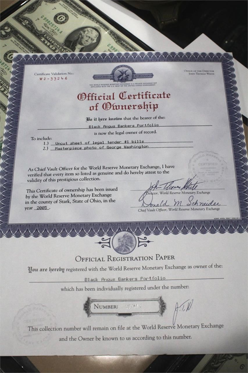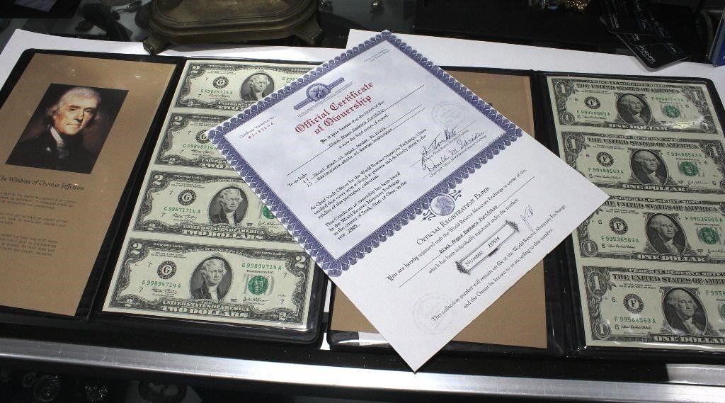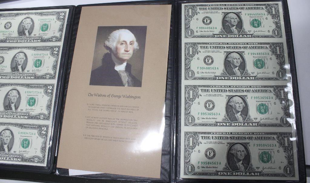 2 Uncut Sheets of Four Each, $1 and $2 FRN Notes. As issued by the World Reserve these items are issued in a leatherette binder, with COA. Make great gifts!