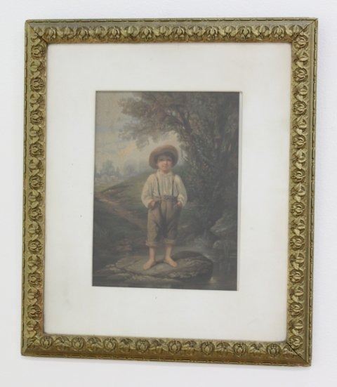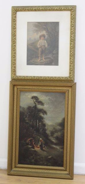 Landscape with campfire, oil on canvas, unsigned, early 20th century, approx. 22" H x 14" W unframed, 27" H x 19" W framed; and young boy in rural landscape, possibly oil on paper, unsigned, not taken out of frame, approx. 12" H x 9" W sight, 22" H x 19" W framed. Wear to edge of frame of oil on paper.
