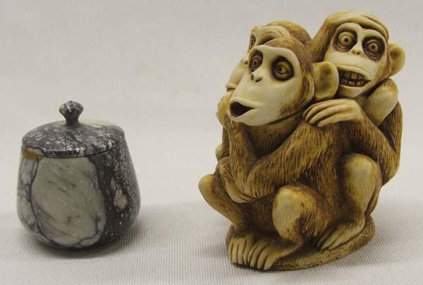 2 Unusual Ring Holders, Small blue pot is made of ashes from Mount St. Helens and monkey ring holder is resin composition, largest measures approx. 2.5''H x 2.25''diameter. Buyers Pay Actual Shipping and Handling Charges(see terms and conditions for more information).