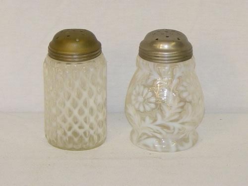 (2) VICTORIAN CLEAR OPALESCENT SHAKERS: (1) RIBBED OPAL LATTICE & (1) DAISY & FERN PATTERN - BOTH W/ OLD TIN LIDS, DENTS TO LIDS, CONTENT STAINS