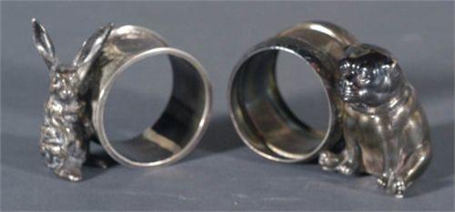 2 VICTORIAN FIGURAL NAPKIN RINGS Large dog, no maker's mark, 50mm high and rabbit, no maker's mark, 60mm high, CONDITION REPORT: Excellent. PACKING AND SHIPPING excl. insurance w/i Contintental U.S. $20 excluding insurance within Continental U.S., multiple lots can be combined at a discount.
