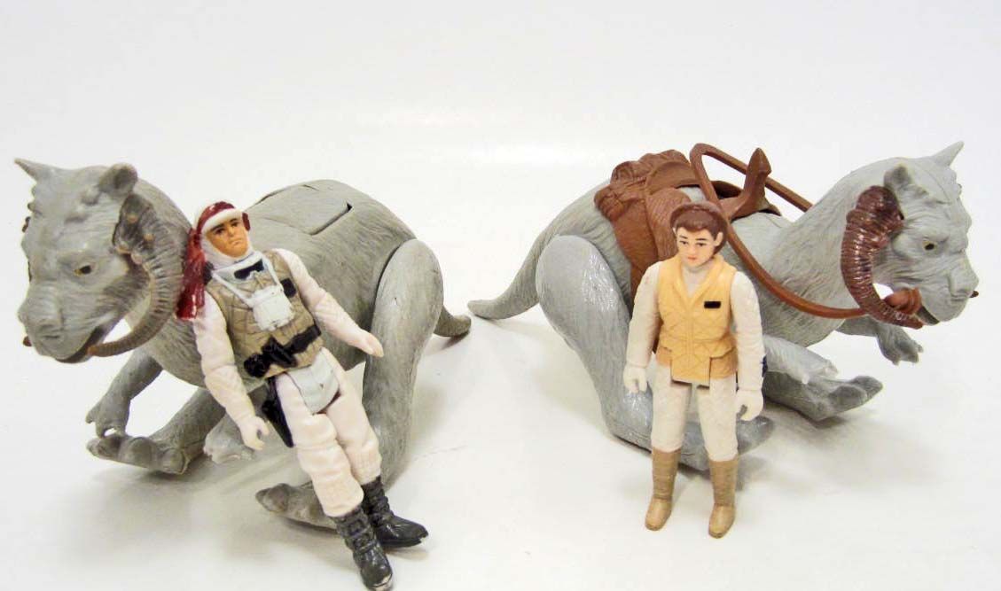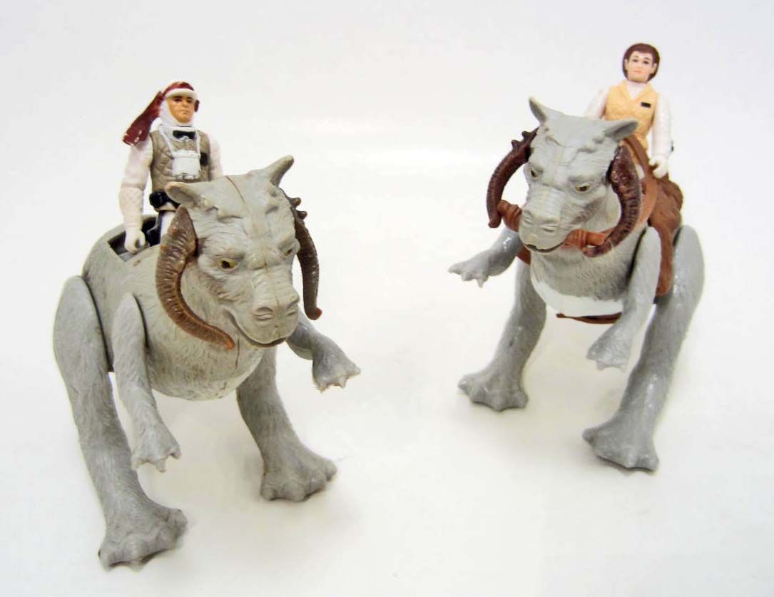 2 Tauntaun Creatures. Includes a Rebel Hoth Trooper, a Hoth Leia and the original instructions. Still works, good played with condition. One is missing the saddle and harness.