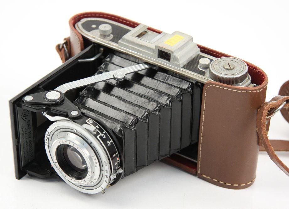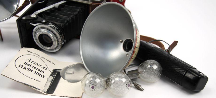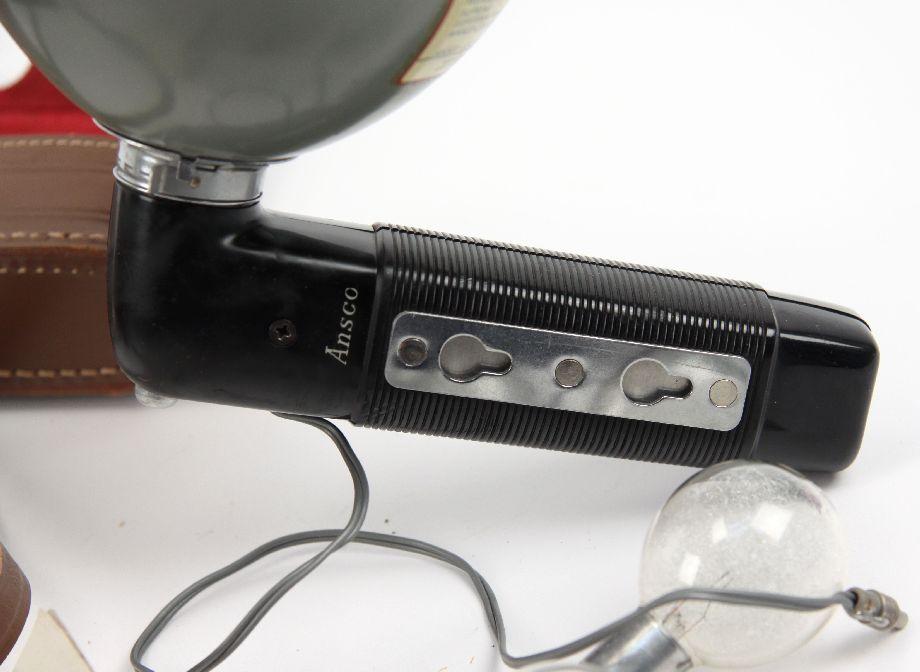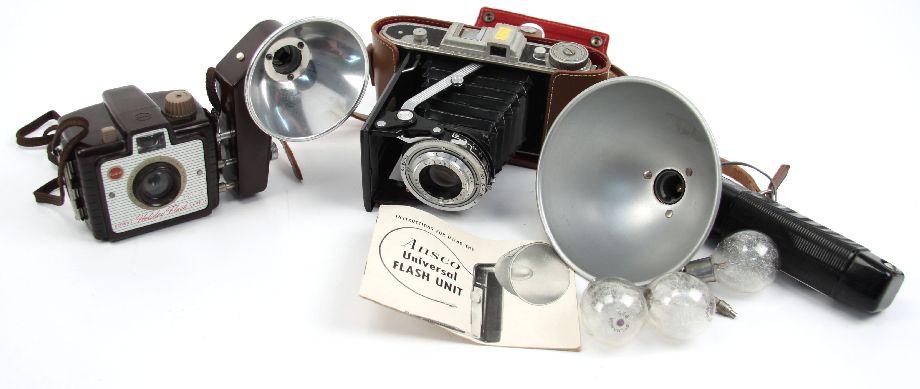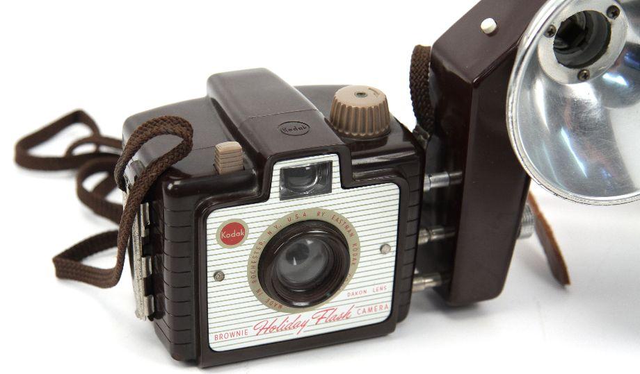 An Ansco Viking camera, complete with leather case, as well s a Kodak Brownie Holiday Camera. Also included are flash holders for both cameras. Both appear in overall very good condition.