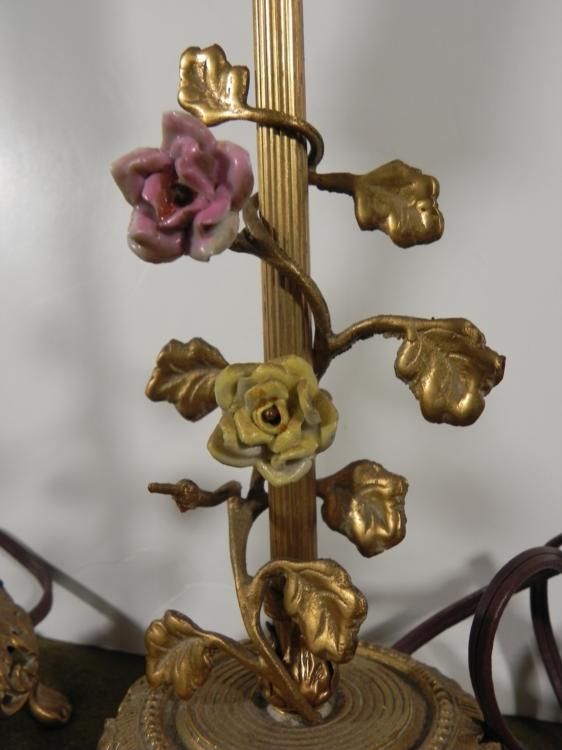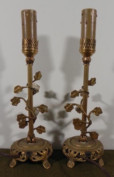 2 VINTAGE CAST BRASS LAMPS--LEAF &FLOWER MOTIF--FAUX DRIPPING"CANDLE BELOW BULBAPPROX 14"" TALL--WITH CORDS--ONE ON-OFF SWITCH"NOT PRESENT ON BASE