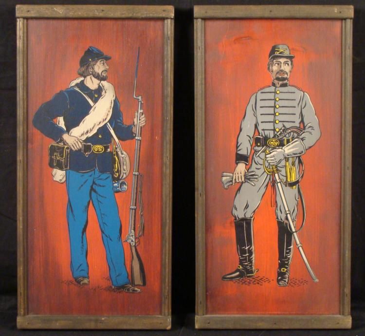 OFFERED HERE ARE TWO VINTAGE CIVIL WAR PAINTINGS ON HEAVY WOOD TYPE FRAMES. ONE IS OF AN UNION & THE OTHER A CONFEDERATE OFFICER. THEY ARE APPROX:19 X 9 X 1 1/4" EACH. *