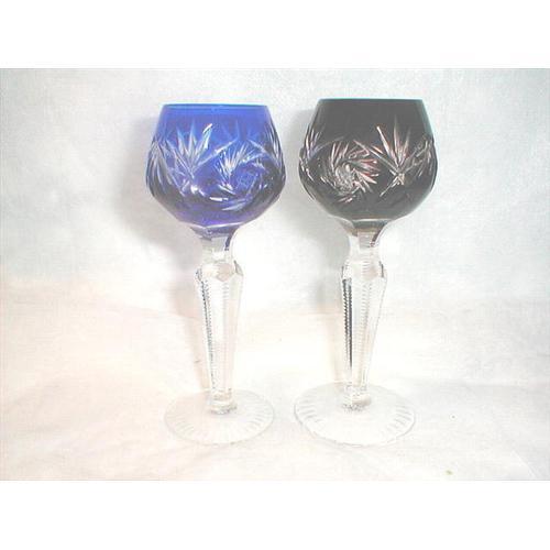 HERE ARE 2 BEAUTIFUL CUT TO CLEAR CORDIAL GOBLETS, ONE BEING COBALT BLUE AND THE OTHER A RUBY RED. EACH GOBLET MEASURES 5 1/2 IN. TALL AND 1 1/2 IN. IN DIAMETER AND BOTH ARE IN WONDERFUL CONDITION WITH NO CHIPS, CRACKS, CLOUDINESS, SCRATCHES OR REPAIRS AND BOTH HAVE THE ZIPPER CUT STEM.