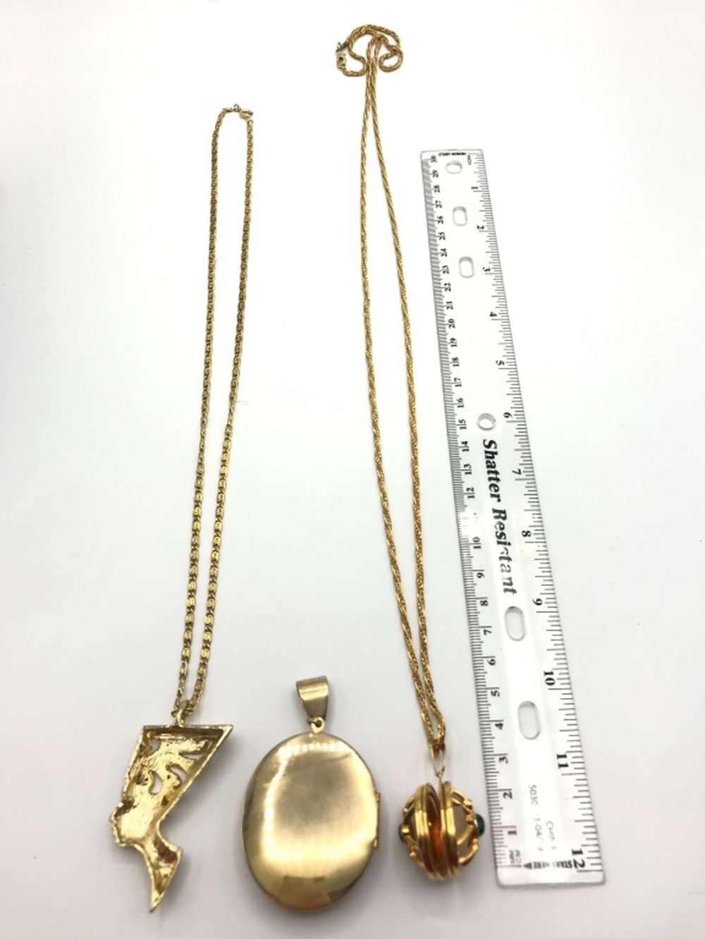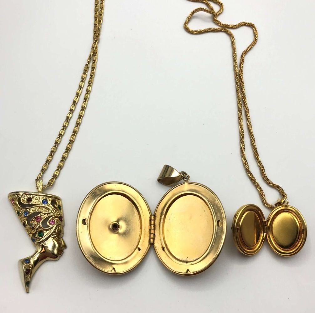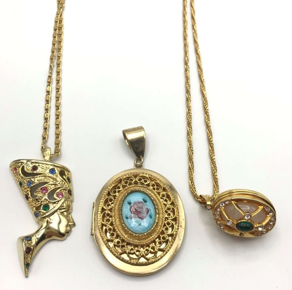 (1)EGYPTIAN WOMAN'S HEAD WITH RHINESTONES (1)3-D CIRCULAR LOCKET PENDANT-LUCITE-RHINESTONES (1)GOLD TONED LOCKET WITH ROSE ENAMEL CENTER