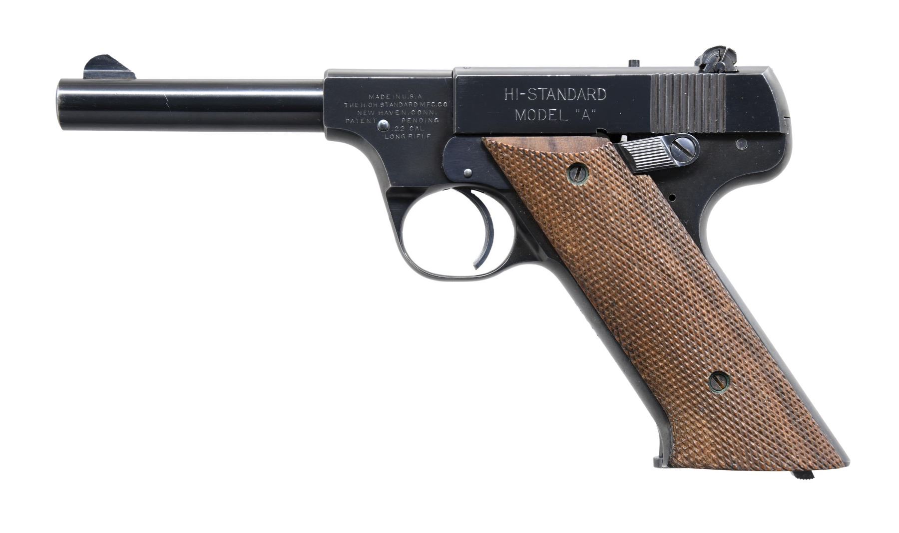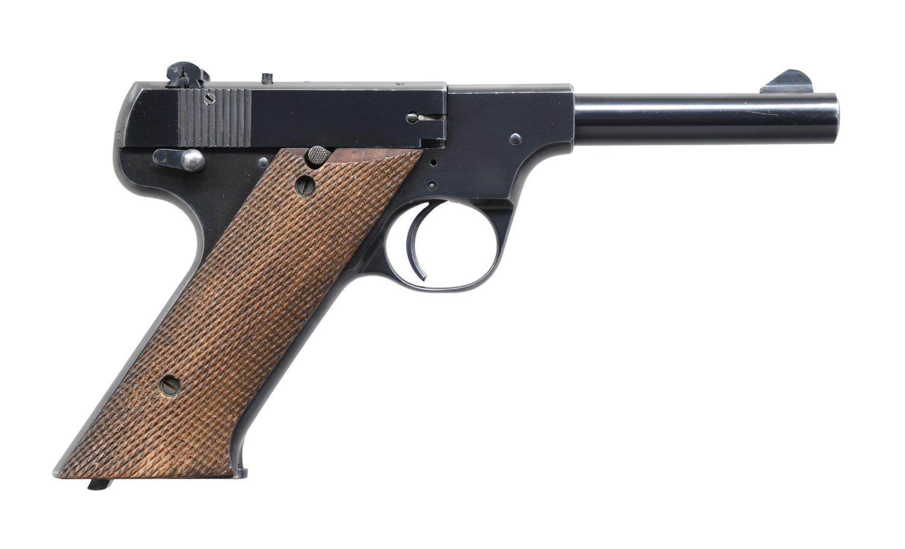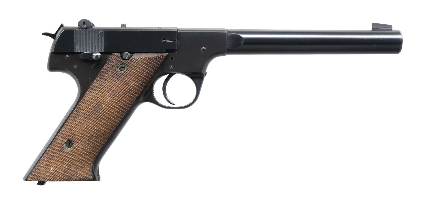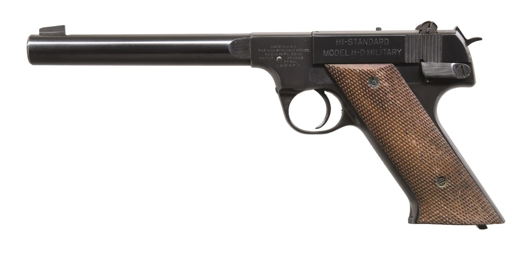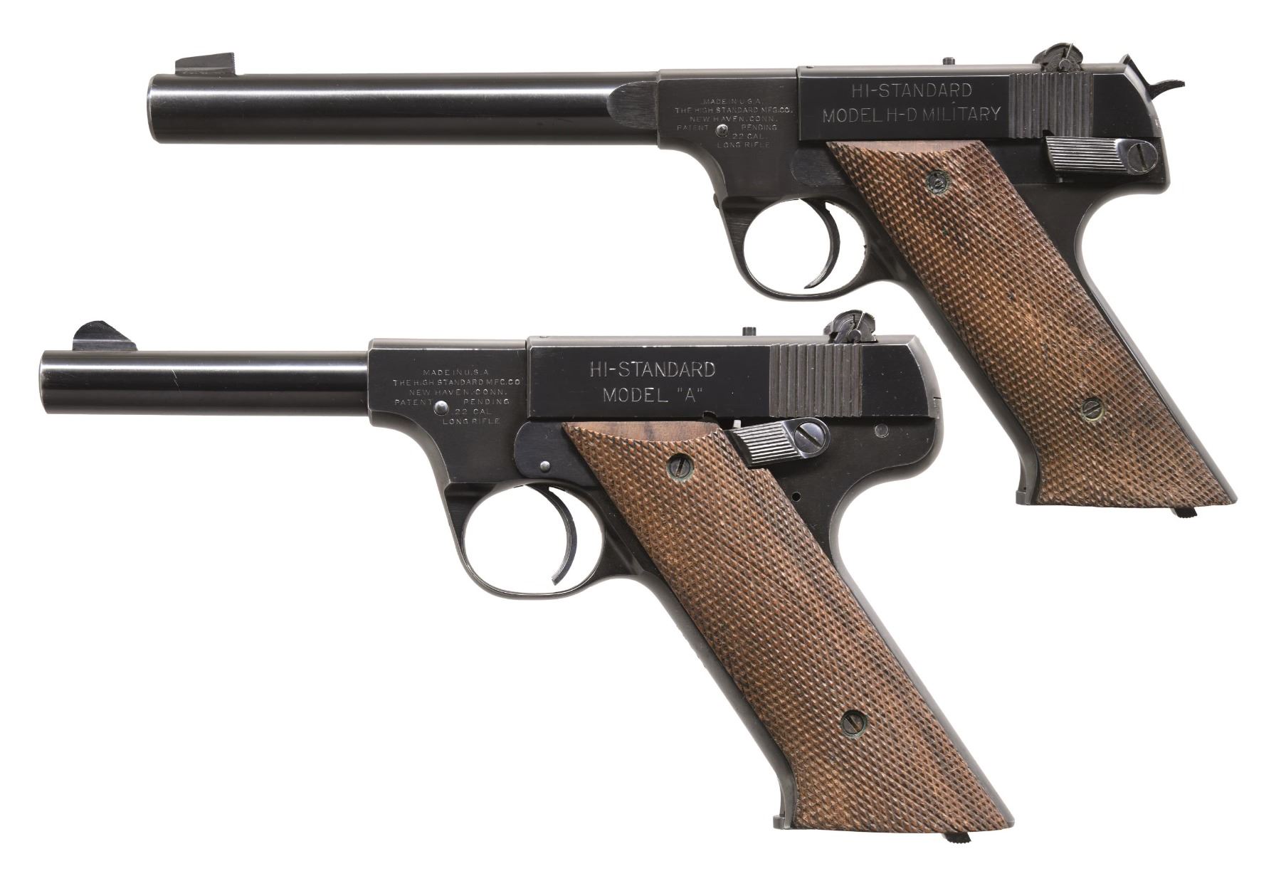 BOTH: Cal. 22 LR. Blued models with checkered walnut grips having slight flare at bottoms. Simple, factory adjustable rear sights, matching numbered slides, takedown buttons on tops of slides along with right side levers, left side serrated safety levers, right side checkered last round slide stops and larger frames for better handling. Mags are interchangeable and latch at bottom rears. CONDITION: about excellent finishes with an occasion very faint small handling mark. Grips also close to excellent as well with an occasional diamond top mark. 1.) H-D MILITARY. S# 229198. Bbl. heavy 6 3/4" with Patridge blade having serrated face. Approx. 143,000 made 1945-1950 as Model 9051 having exposed hammers and trigger stops; commercial version of same pistol used for training in WW-II. MAGS: 1 factory marked all blue 10 rd. with secondary latch provision near top for other HS models. (24-7223/NW). 2.) MODEL A. S# 82744. Bbl. lightweight 4 1/2" with blade sight having serrated and slanted face. Approx. 7,300 made 1938-1942 as Model 9005 having concealed hammers. MAGS: 1 unmarked 2 tone 10 rd. (24-7229/NW). BOTH CURIOS. $800-1,200 FOR BOTH.
