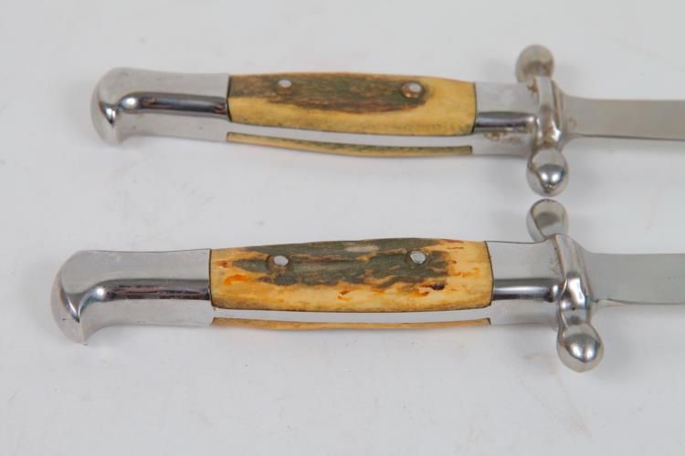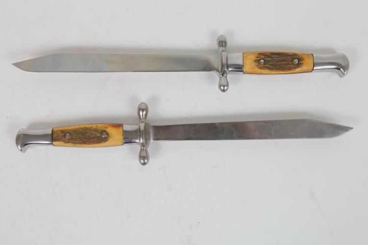 2 VINTAGE HUNTER'S SKINNING KNIVES-STAG GRIPS--12"--SHARPEXTREMELY WELL MADE-DOUBLE RIVET GRIPS--HEAVY STEEL--ROUNDED CROSSGUARD ENDS