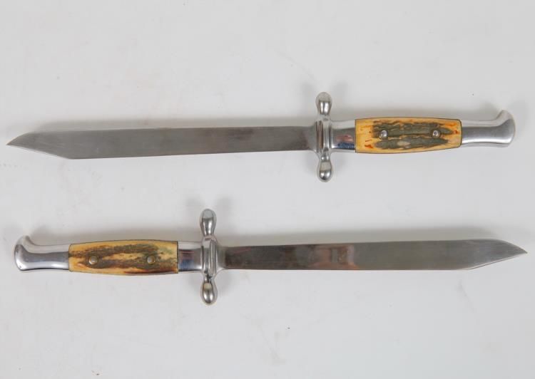 2 VINTAGE HUNTER'S SKINNING KNIVES-STAG GRIPS--12"--SHARP EXTREMELY WELL MADE-DOUBLE RIVET GRIPS--HEAVY STEEL--ROUNDED CROSSGUARD ENDS