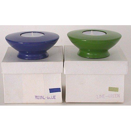 Up for auction are TWO Stunning lacquerware wooden candle holders in assorted hi-gloss colors, space-age design, each 1-1/4" tall, marked "Japan," each in its original gift box. We have included one easily replaced tea candle with each.