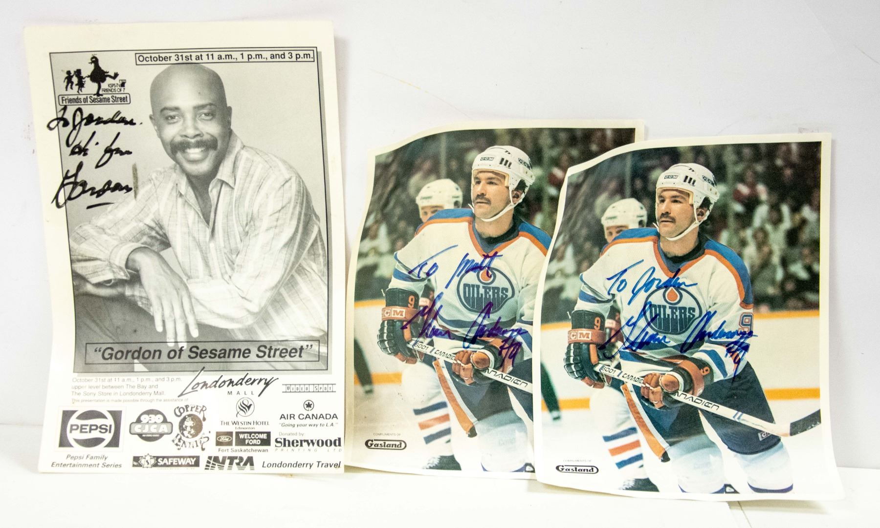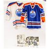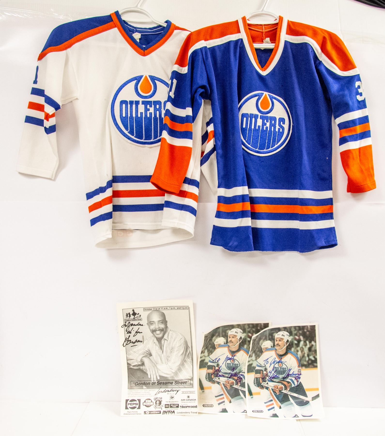 2 VINTAGE KIDS OILERS JERSEYS & 2 SIGNED PICS