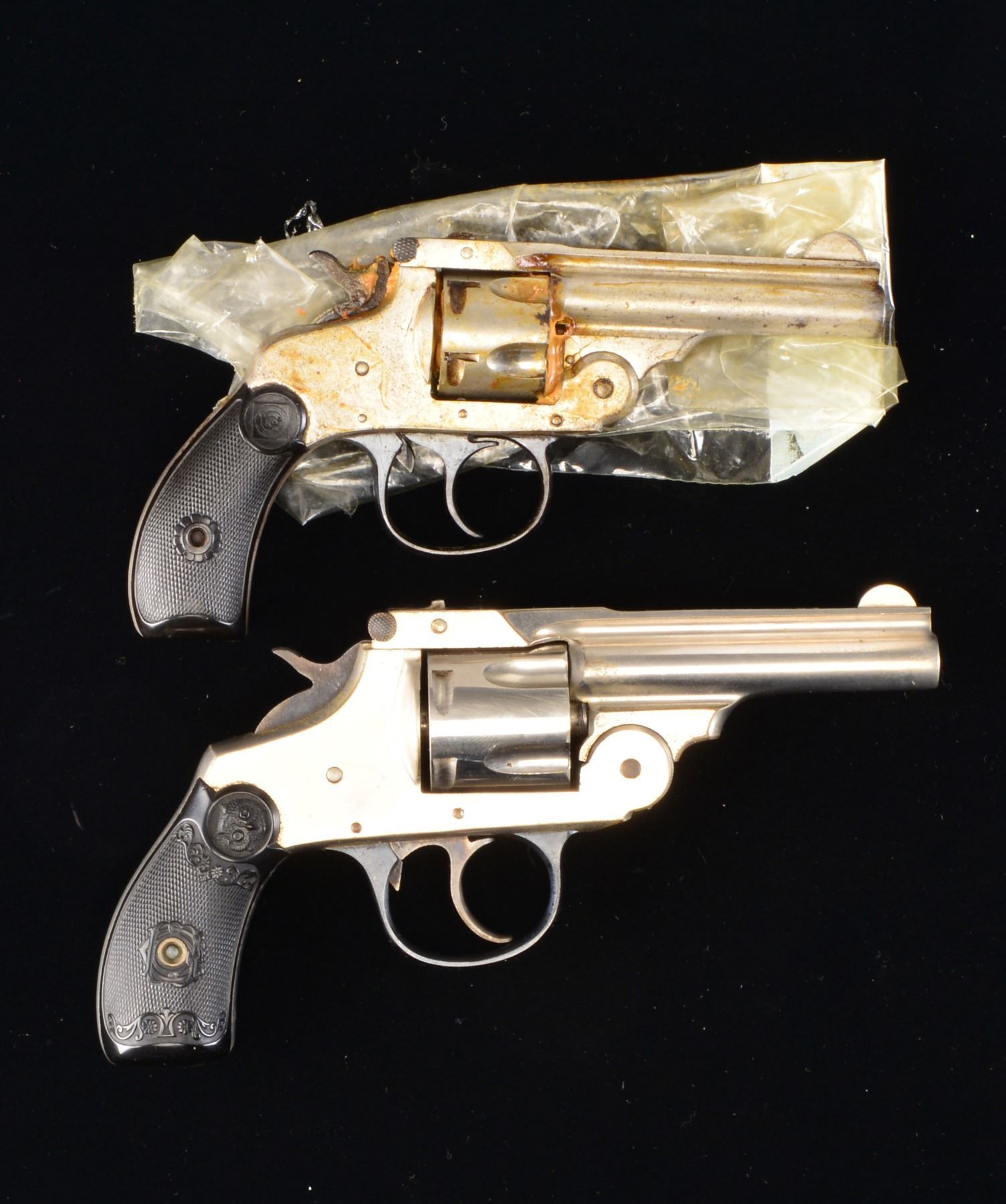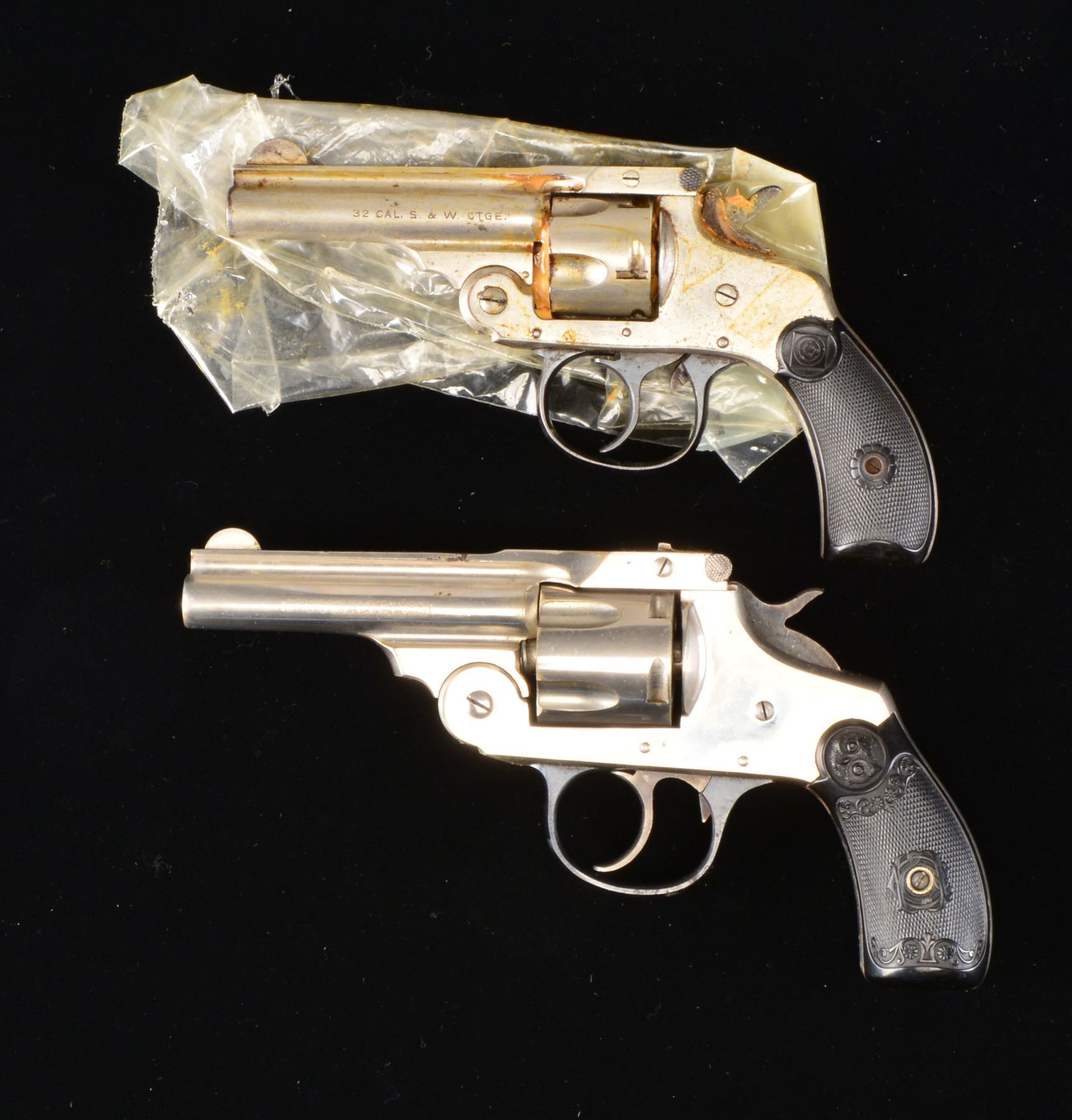 1) HARRINGTON & RICHARDSON AUTO EJECTING THIRD MODEL. Cal. 32 S&W. S# 316014. Bbl. 3" w/ half moon blade & no patent date; cal. on left side. Mfg. 1913-1915 w/ blued trigger guard & checkered target logo hard rubber grips. CONDITION: fair appearance w/ some light oxidation & nickel loss. Entire revolver filled w/ light colored grease limiting further inspection. Very good grips. (20-774/NW). 2) IVER JOHNSON 2ND. MODEL SAFETY AUTO HAMMER. Cal. 38 S&W. S# 5371. Bbl. 3 1/4" w/ blade sight; mfg. 1896-1908. Checkered hard rubber owl's head logo grips & blued matching numbered trigger guard. CONDITION: very good (somewhat dull) overall appearance w/ sm. spot of finish loss on bbl. & butt plus light peppery oxidation. Good plus bore w/ occasional sm. pitting spots. Near excellent grips. (20-776/NW). BOTH CURIO. $300-450.
