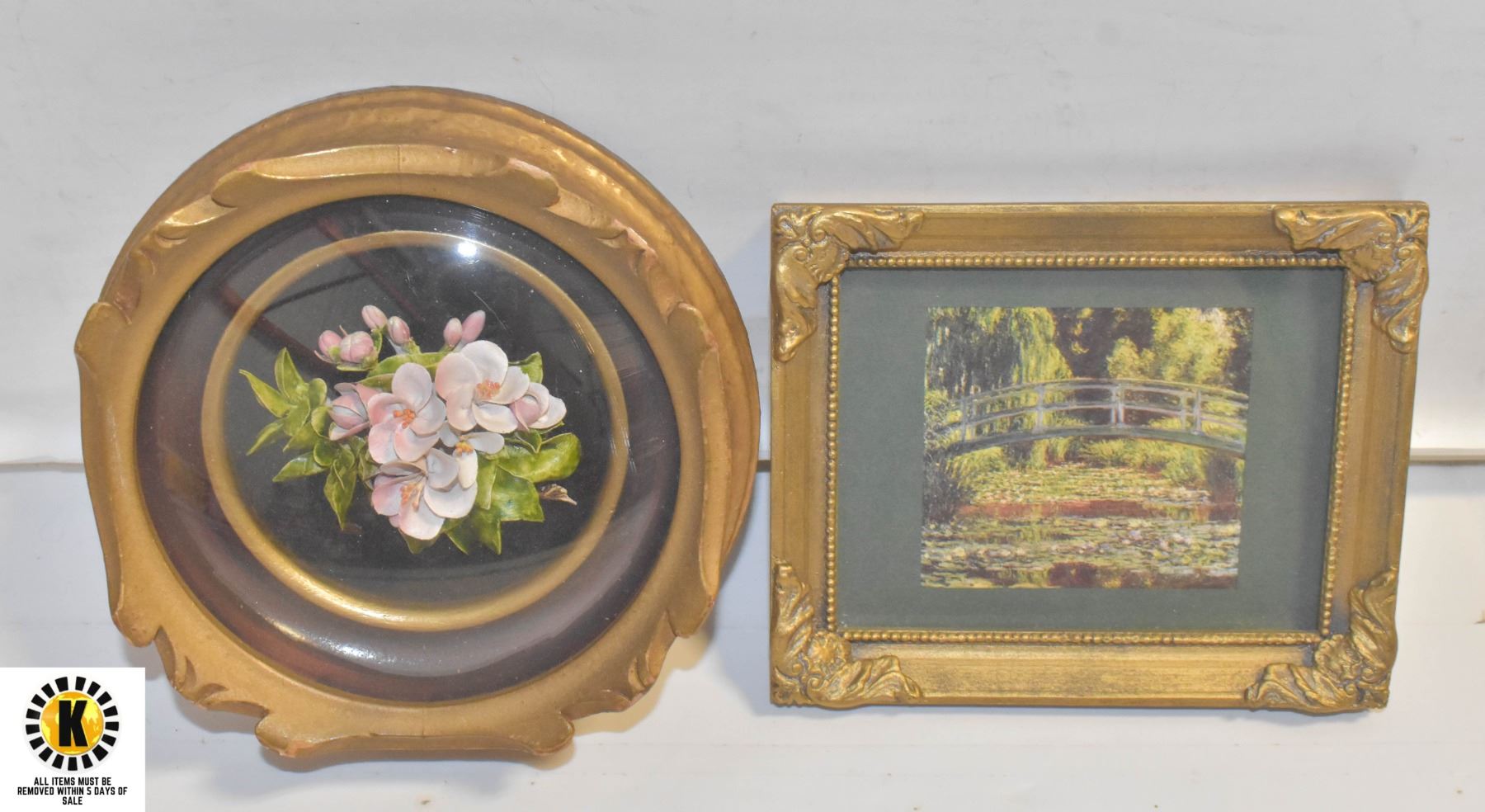 GOLD FRAMES A MONET PRINT MINI, AND A HANDMADE CAPODIMONTE STYLE MOUNTED FLOWER FIGURINE ARTWORK IN A VINTAGE ROUND FRAME.