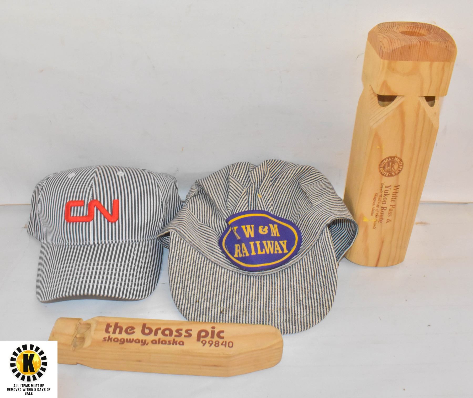 2 VINTAGE RAILWAY HATS & 2 WOODEN STEAM WHISTLES