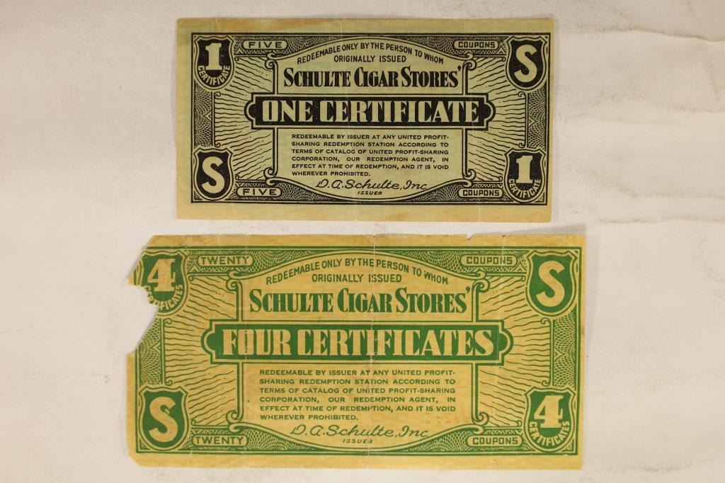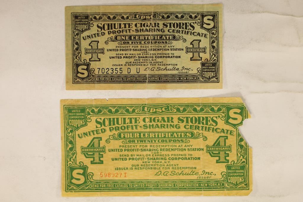 SHARING CERTIFICATES / COUPONS: ONE IS 1 CERTIFICATE/5 COUPONS & ONE IS 4 CERTIFICATES/20 COUPONS. LARGER ONE IS TORN ON THE UPPER RIGHT CORNER