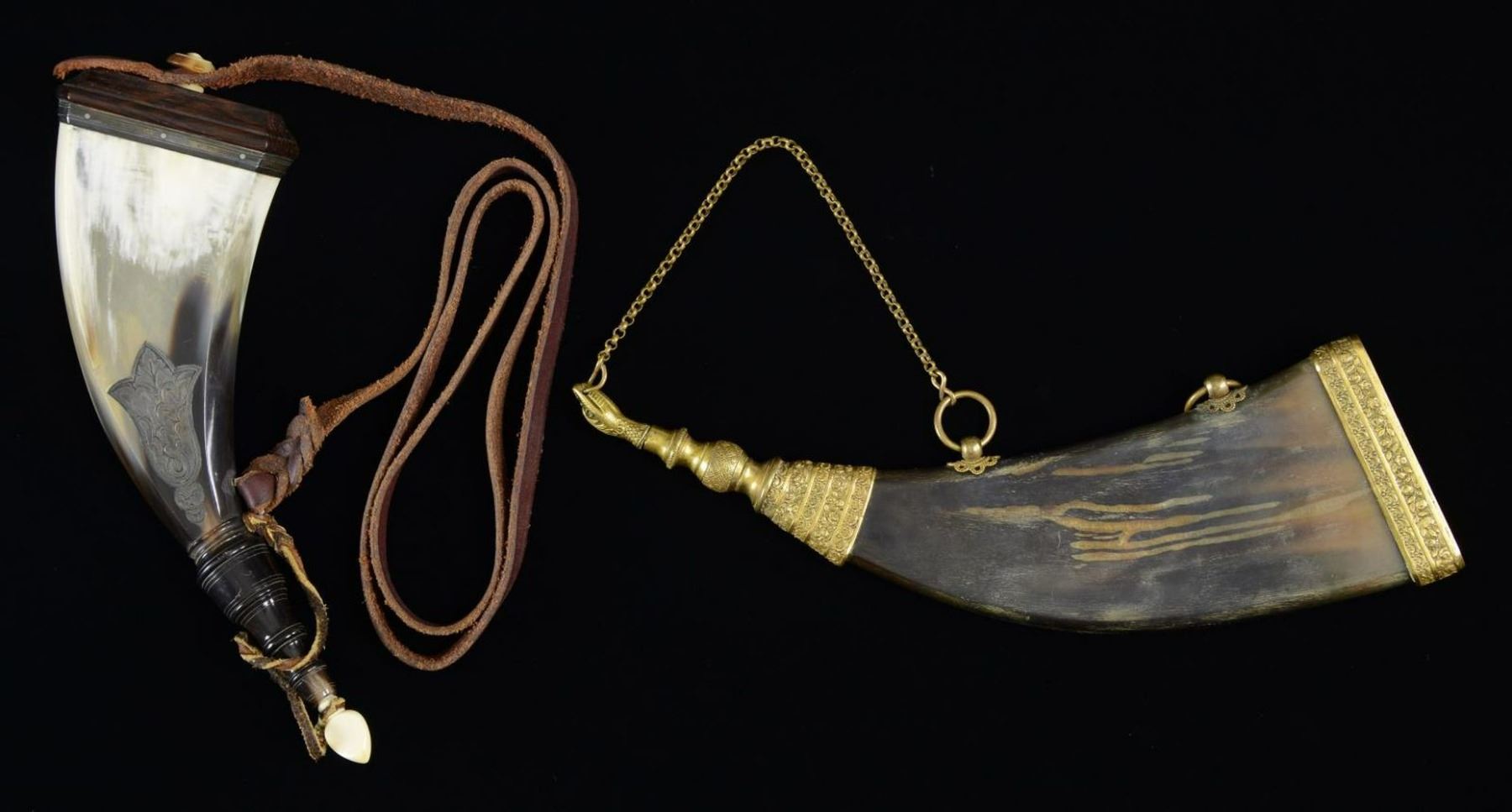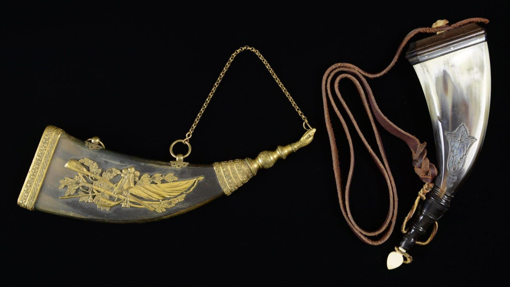 1) Overall length: 9 5/8”. Width: 3”. This horn has an elaborate gilded brass spout & buttcap. The spout plug is in the shape of a dragon head and has a pick on the other end. Both the spout and the butt are completely decorated with foliate & scroll motifs. The face of the horn has a large gilded brass applied spray of arms that includes a gun, sword, hat, flag, and powder horn. CONDITION: light wear overall. 2) Overall length: 8 1/4”. Width: 2 1/2". This horn has a wood plug & spout. The plug has a carved horn finial, and the spout has a bone plug with a pick on the end. The body of the horn has a silver inlay in the shape of a tulip with foliate motifs. CONDITION: very light wear. (02-17917/BF). $400-600.