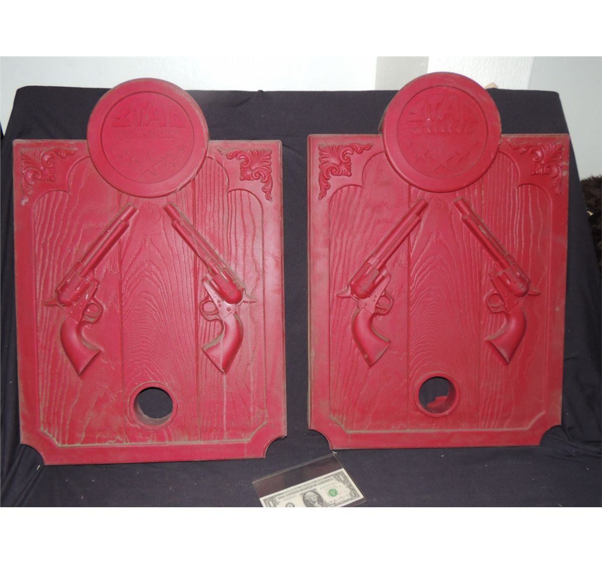 Offered here are two very cool red Star Galleries gun mats made out of a wooden board covered in hard rubber with nice old western detail on the front side. Makes an awesome display.