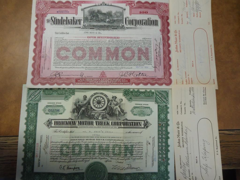 1928 BROCKWAY MOTOR TRUCK CORPORATION AND 1934 STUDEBAKER CORPORATION WITH SECURITY WITHDRAWAL SLIPS.
