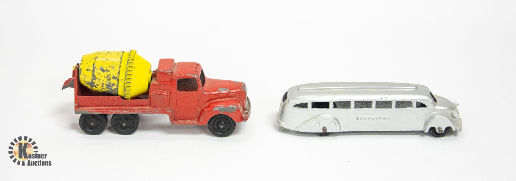 2 VINTAGE TOOTSIE TOYS: CEMENT MIXER, GREYHOUND