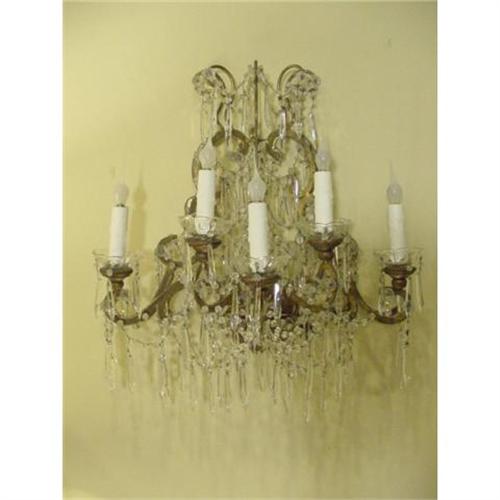 <table width="100%" border="0" cellspacing="0" cellpadding="4"><tr><td><em> </em></td></tr><tr> <td width="100%"> Pair of Italian Rococco Style Gilt Iron and cut glass 5 light sconces from Virginia Graham Fair Vanderbilt Mansion c. 1900 </td></tr><tr> <td> </td></tr><tr> <td>Reference #: LT216</td></tr><tr><td>Condition:good</td></tr><tr><td>Year:1900</td></tr><tr><td>Height:23</td></tr><tr><td>Depth:11</td></tr><tr><td>Width:21</td></tr><tr><td>Title:2 Vanderbilt Mansion light Sconces</td></tr><tr><td>Location:Atlanta, GA</td></tr></table>