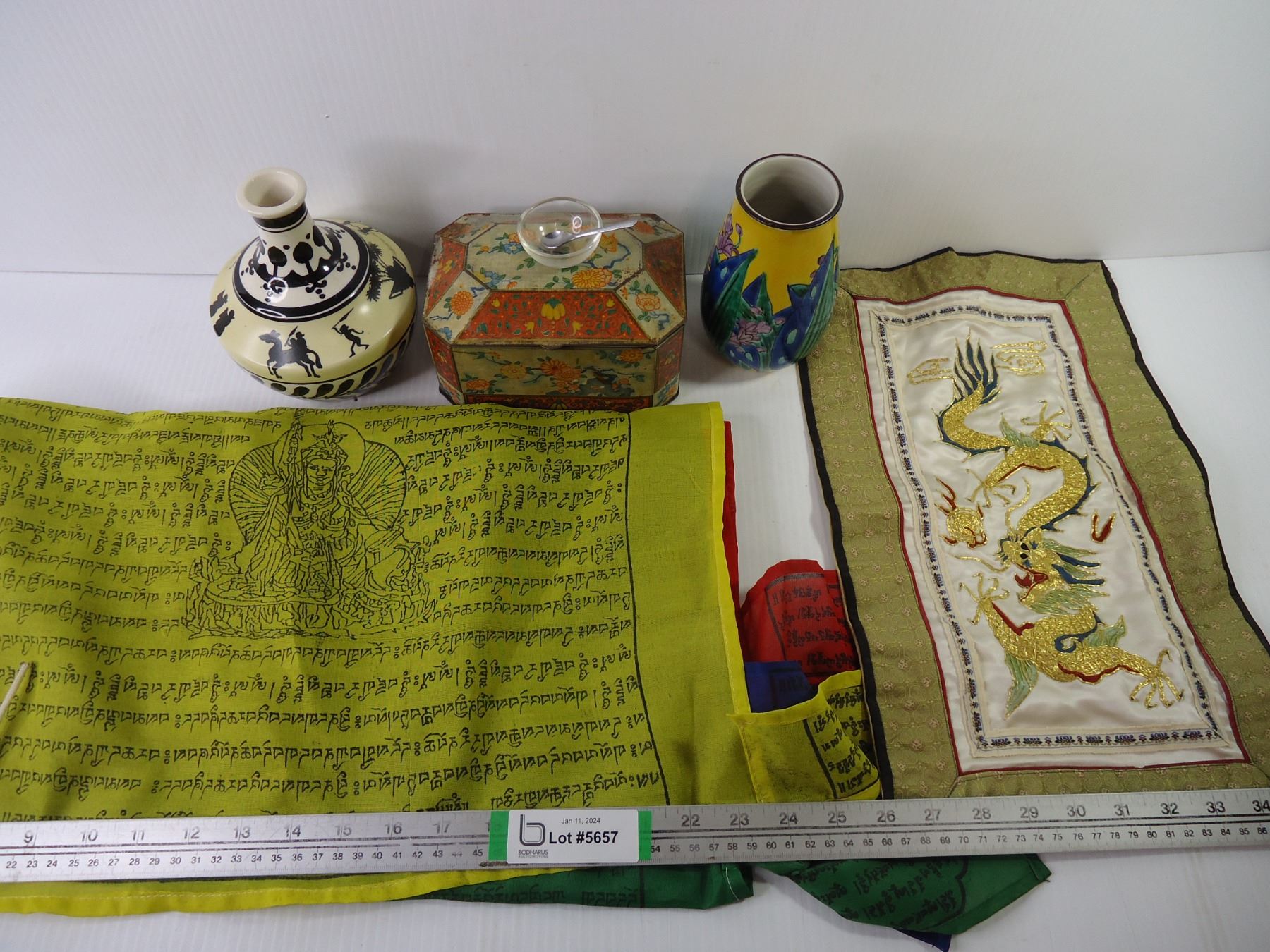 (2) Vases, Tin, Banner, and Silk Embroidery Panel