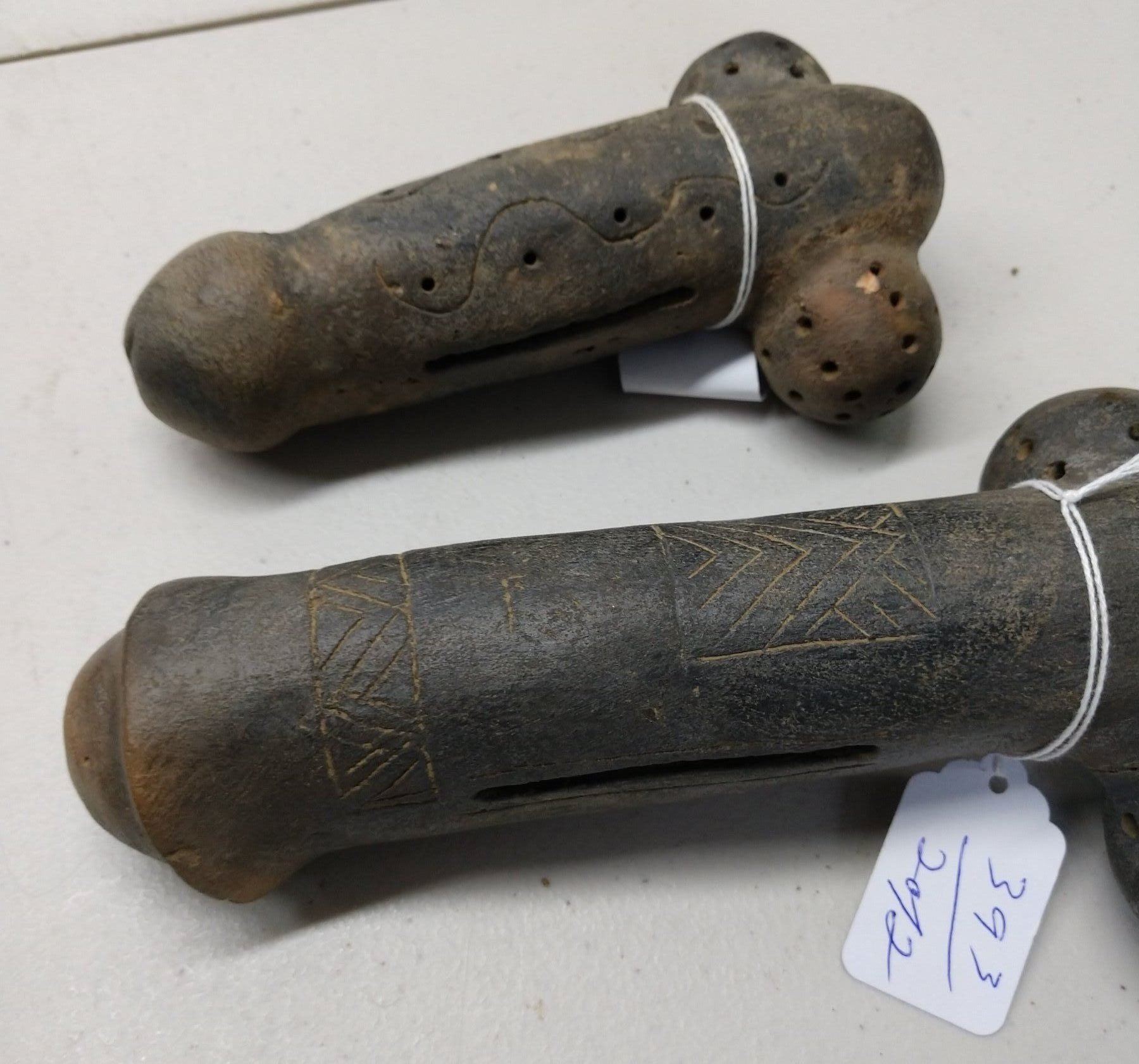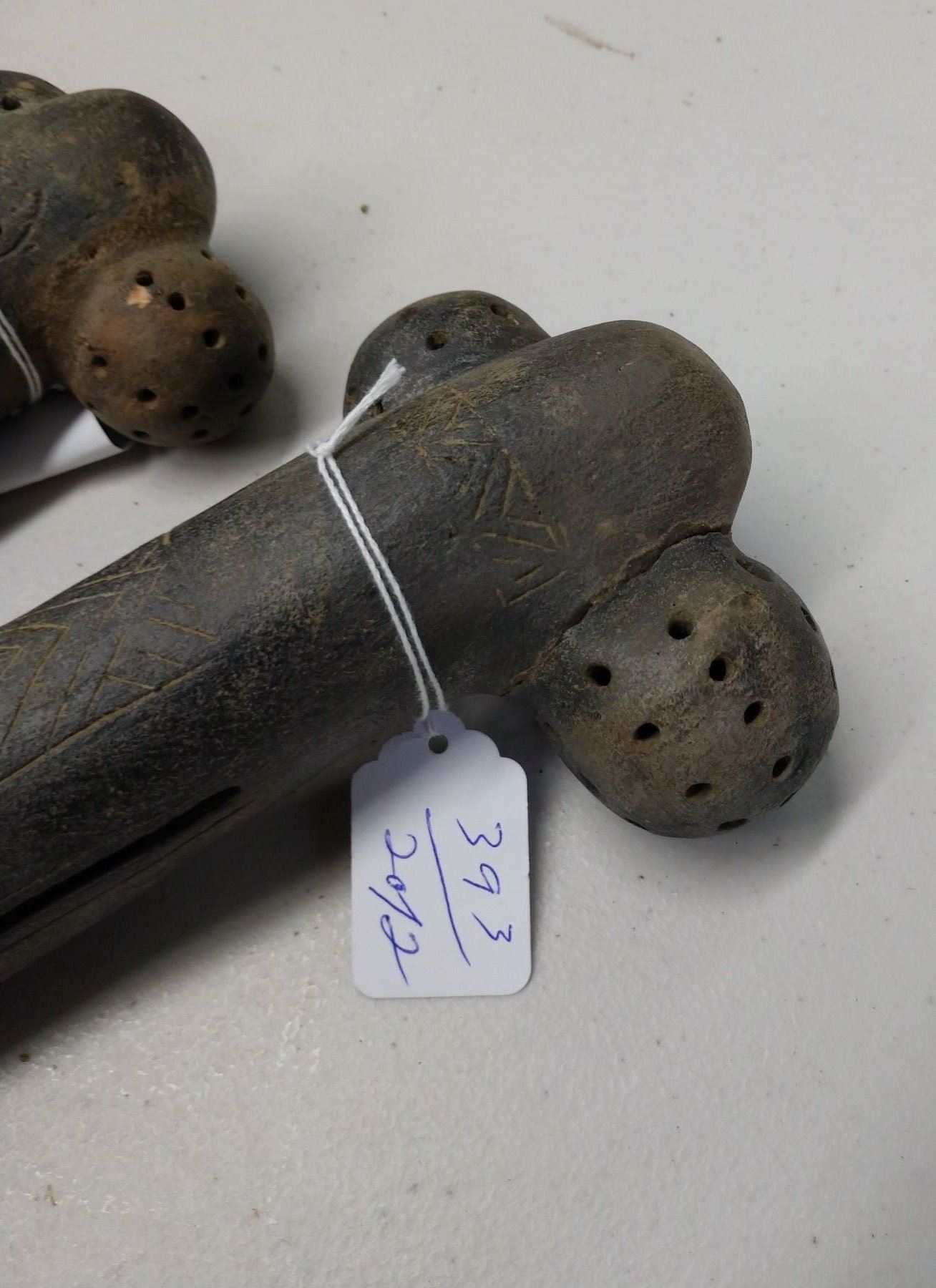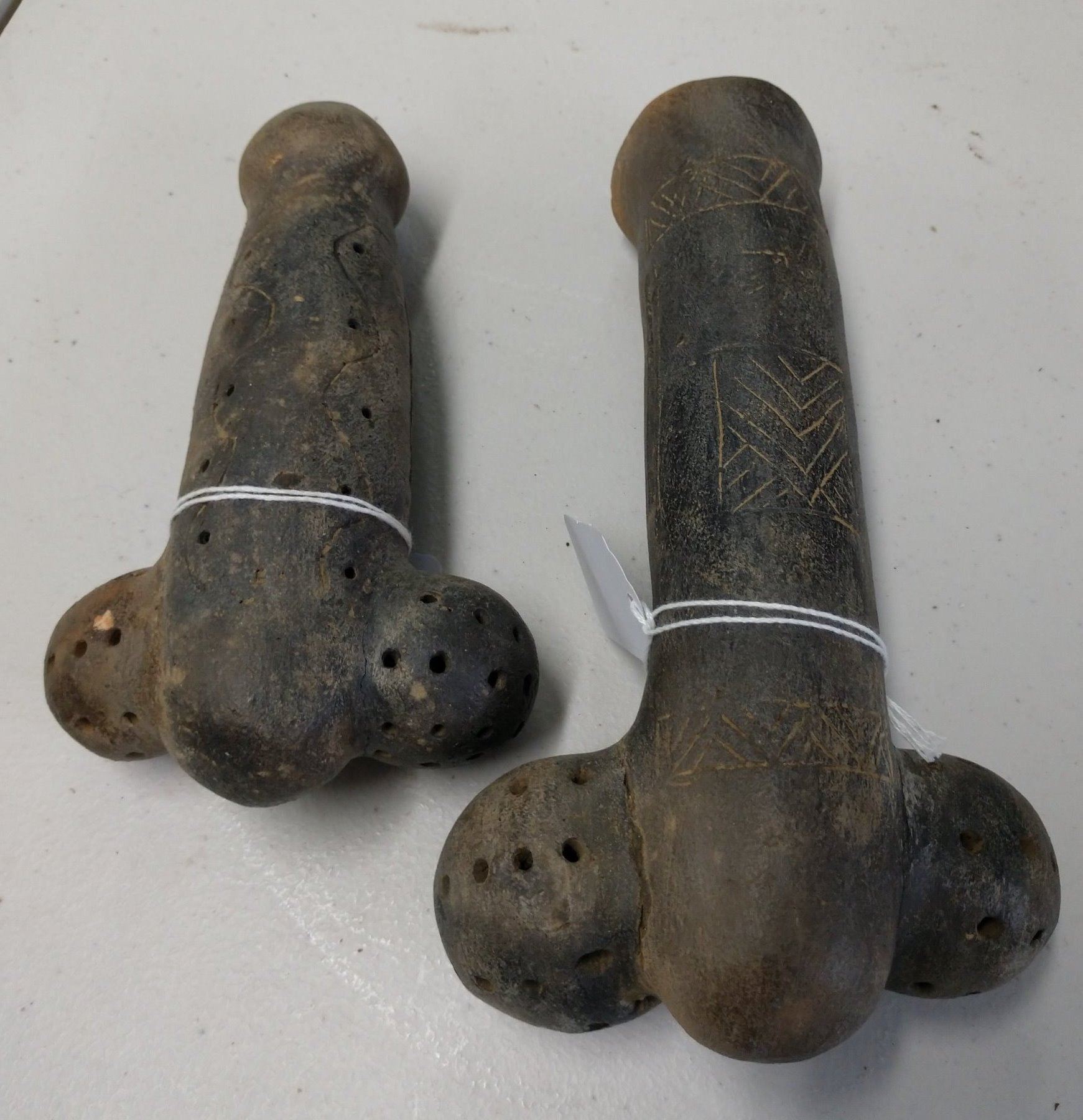 2 Veracruz Fertility Figures, pre-Columbian items. Made of clay, the items measure 8 1/2" and 6 1/2" long. Veracruz, Mexico. From an old, 1960s California collection. Engraved and perforated. Condition: Good, one has crack, see images. Shipping: $26.50 w/insurance and signature.