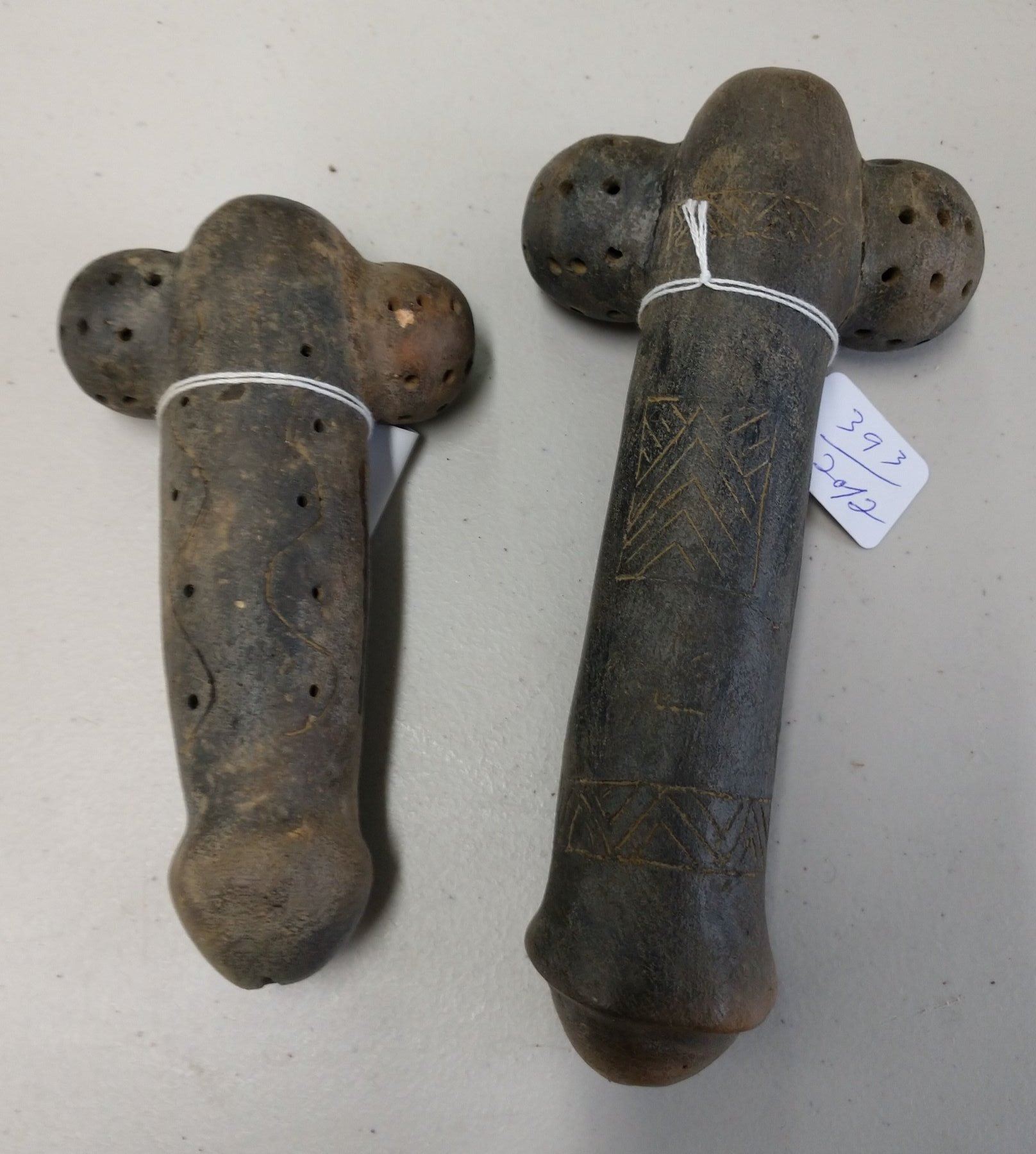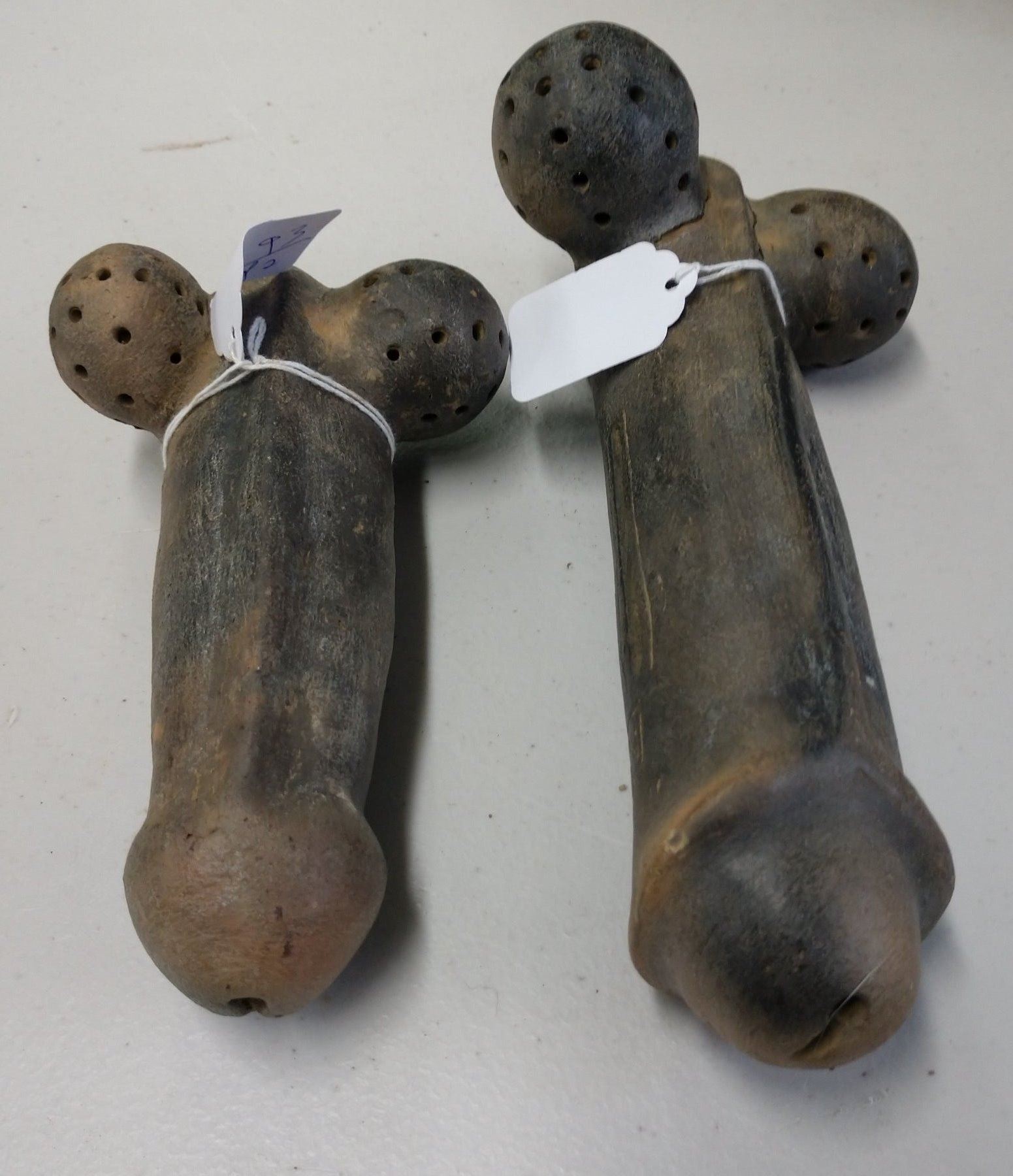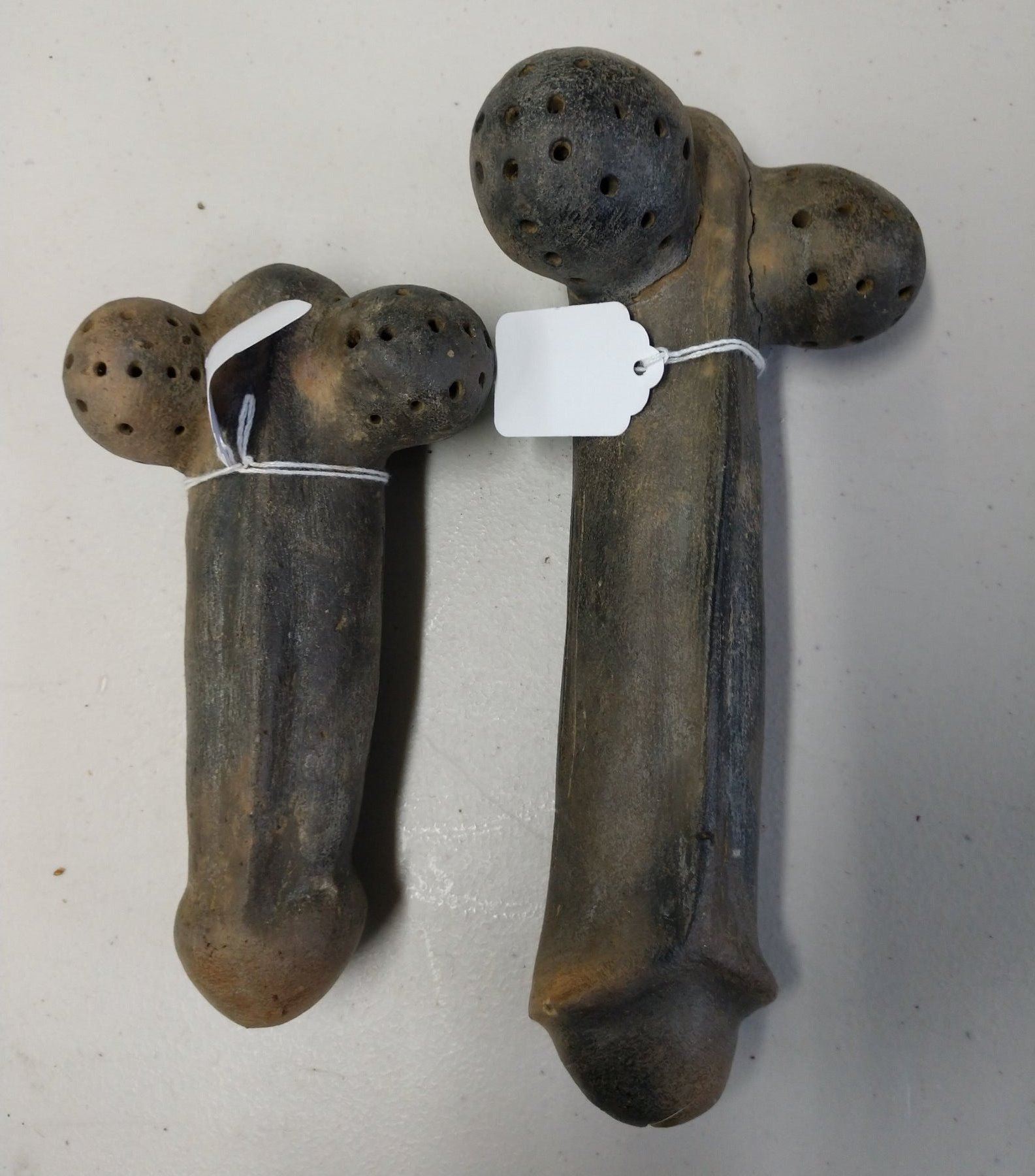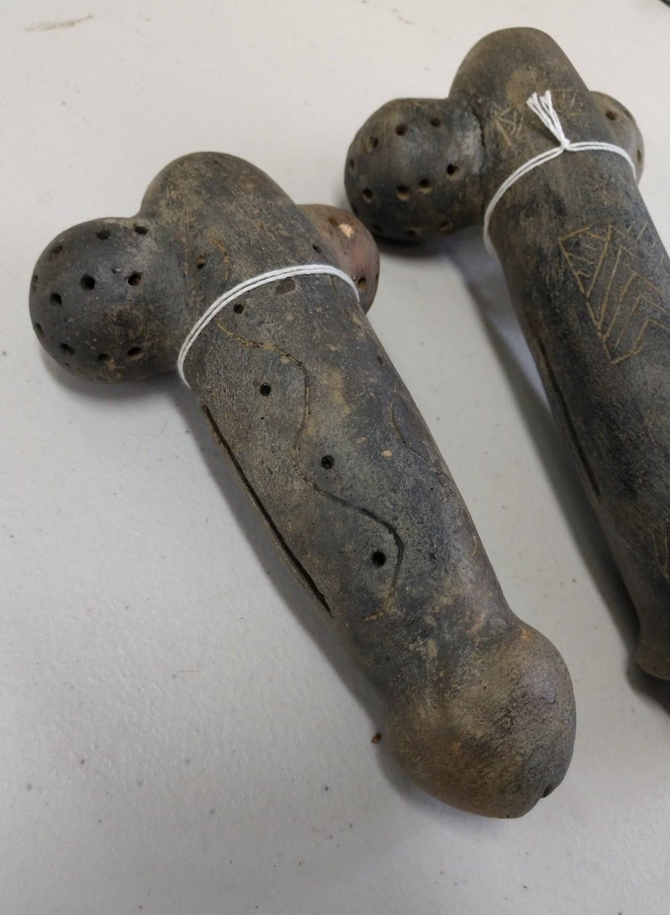 2 Veracruz Fertility Figures, pre-Columbian items. Made of clay, the items measure 8 1/2" and 6 1/2" long. Veracruz, Mexico. From an old, 1960s California collection. Engraved and perforated. Condition: Good, one has crack, see images. Shipping: $26.50 w/insurance and signature.