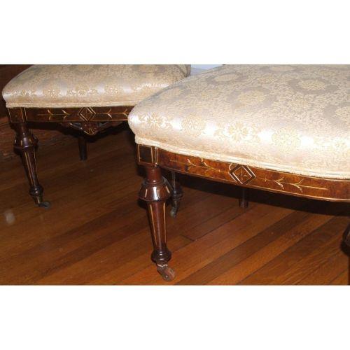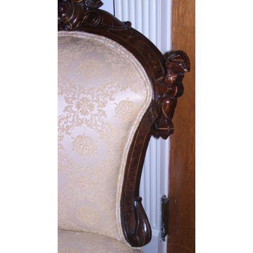 American. Victorian. Mid 19th century. Walnut with burl. Pair of two matching Renaissance Revival side chairs with turned trumpet feet, a fabric covered seat and back below a heavily carved crest with a portrait medallion below a curtained stage. Gold trim throughout. Attributed to John Jellif, Newark, NJ. 39" high.