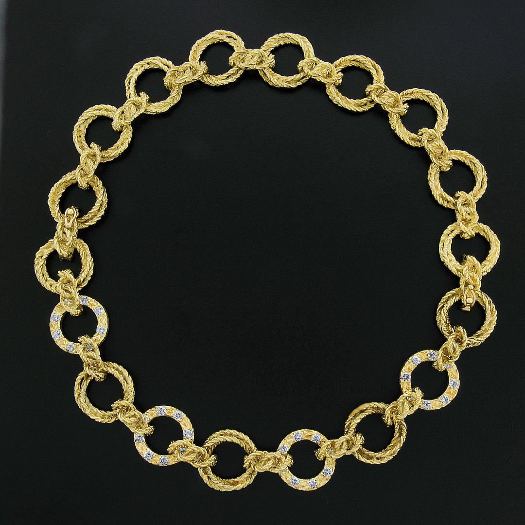 A vintage solid 18k yellow gold twisted wire link set of 2 bracelets or necklace, featuring 32 round brilliant cut natural diamonds (G/H - VS2/SI1 ; 2.56ctw ). It weighs a total of 90.50 grams, measures 18mm wide, and measures each 6.75 inches in length.