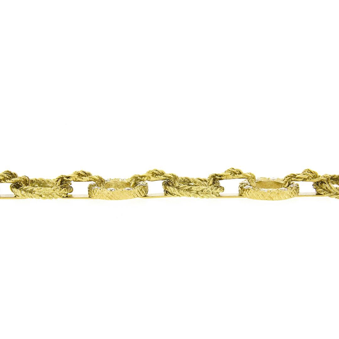 A vintage solid 18k yellow gold twisted wire link set of 2 bracelets or necklace, featuring 32 round brilliant cut natural diamonds (G/H - VS2/SI1 ; 2.56ctw ). It weighs a total of 90.50 grams, measures 18mm wide, and measures each 6.75 inches in length.