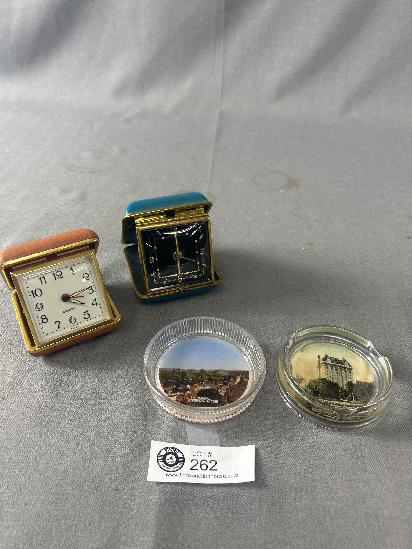 2 Vintage Alarm Clocks & 2 Glass Ashtrays