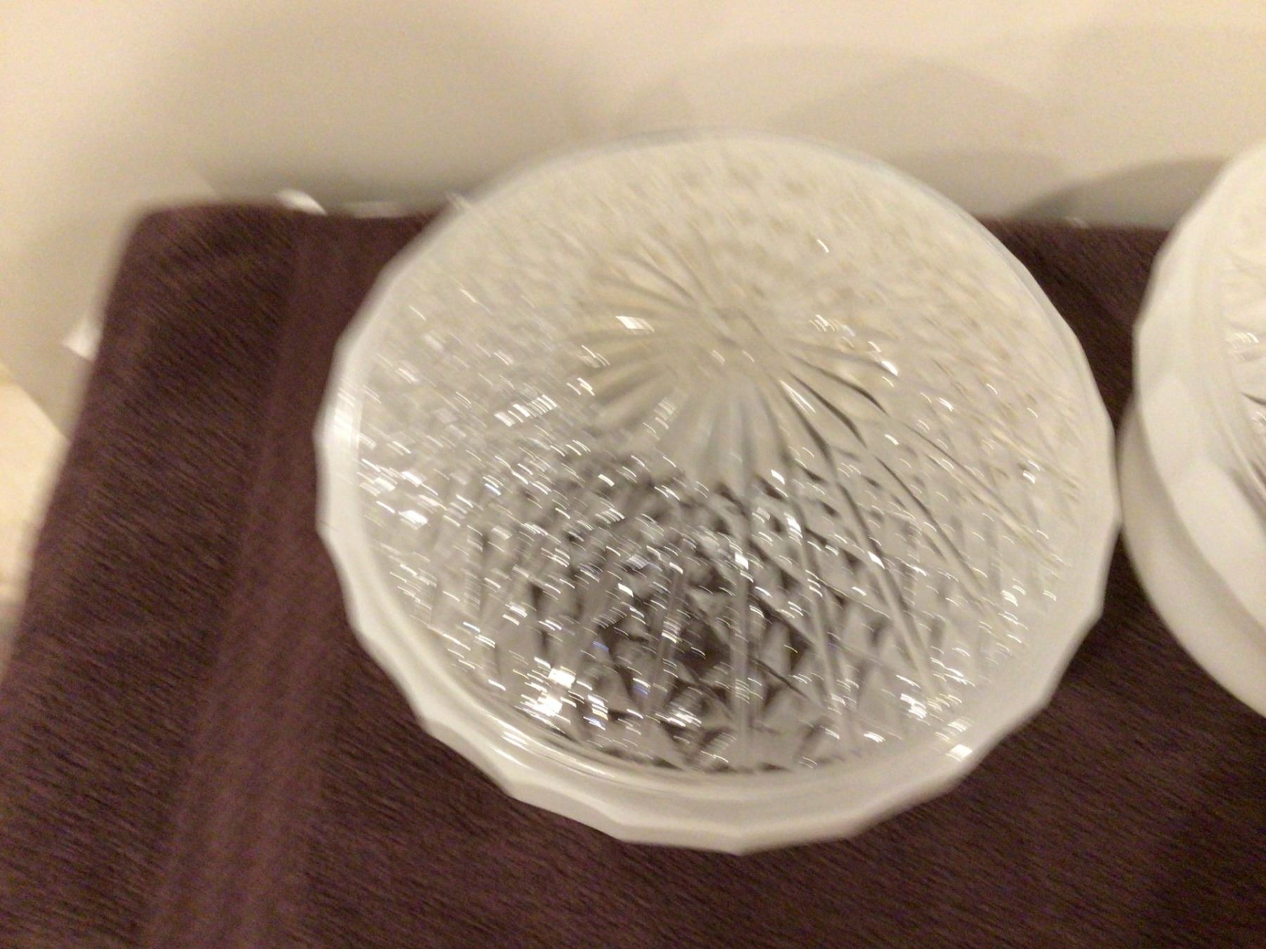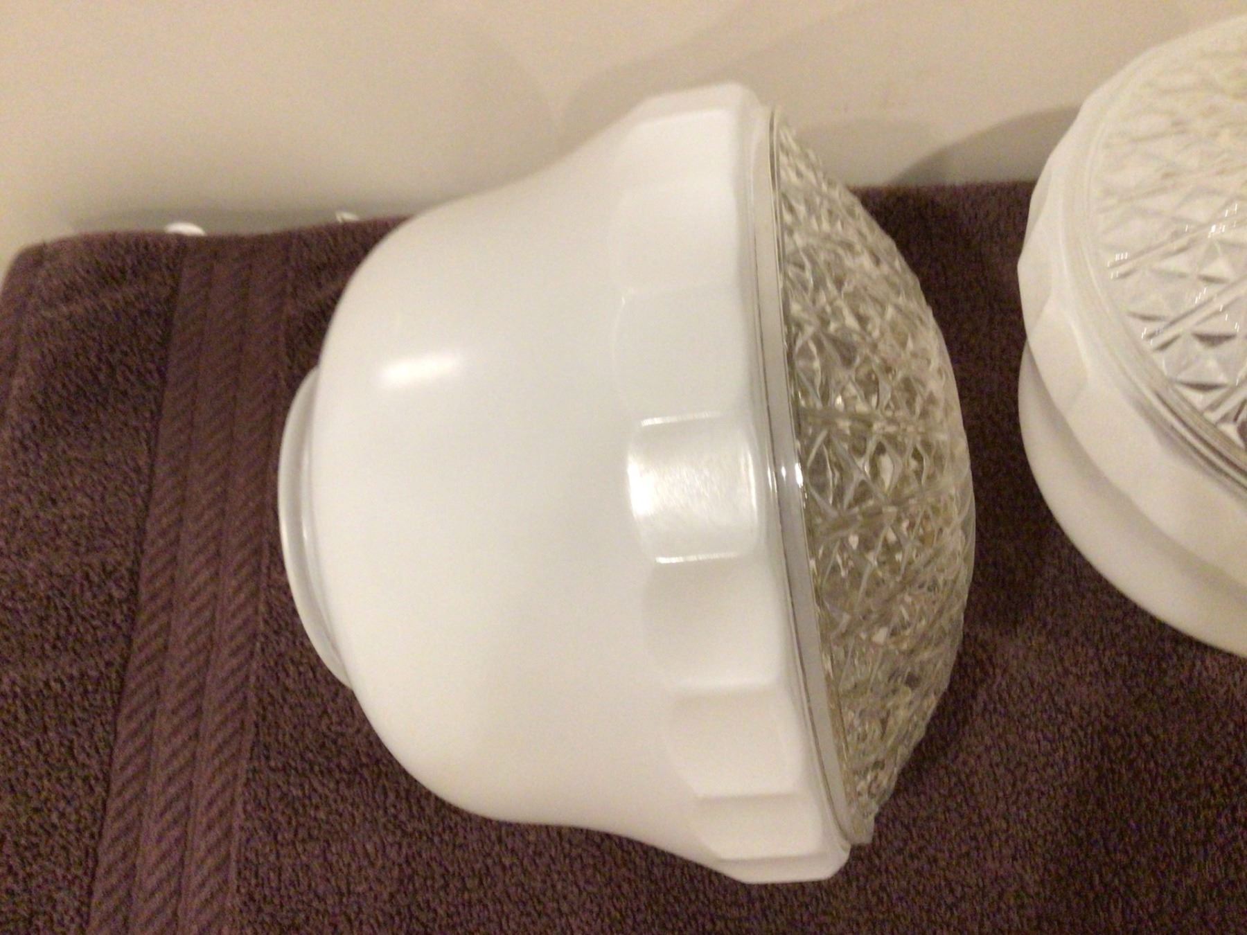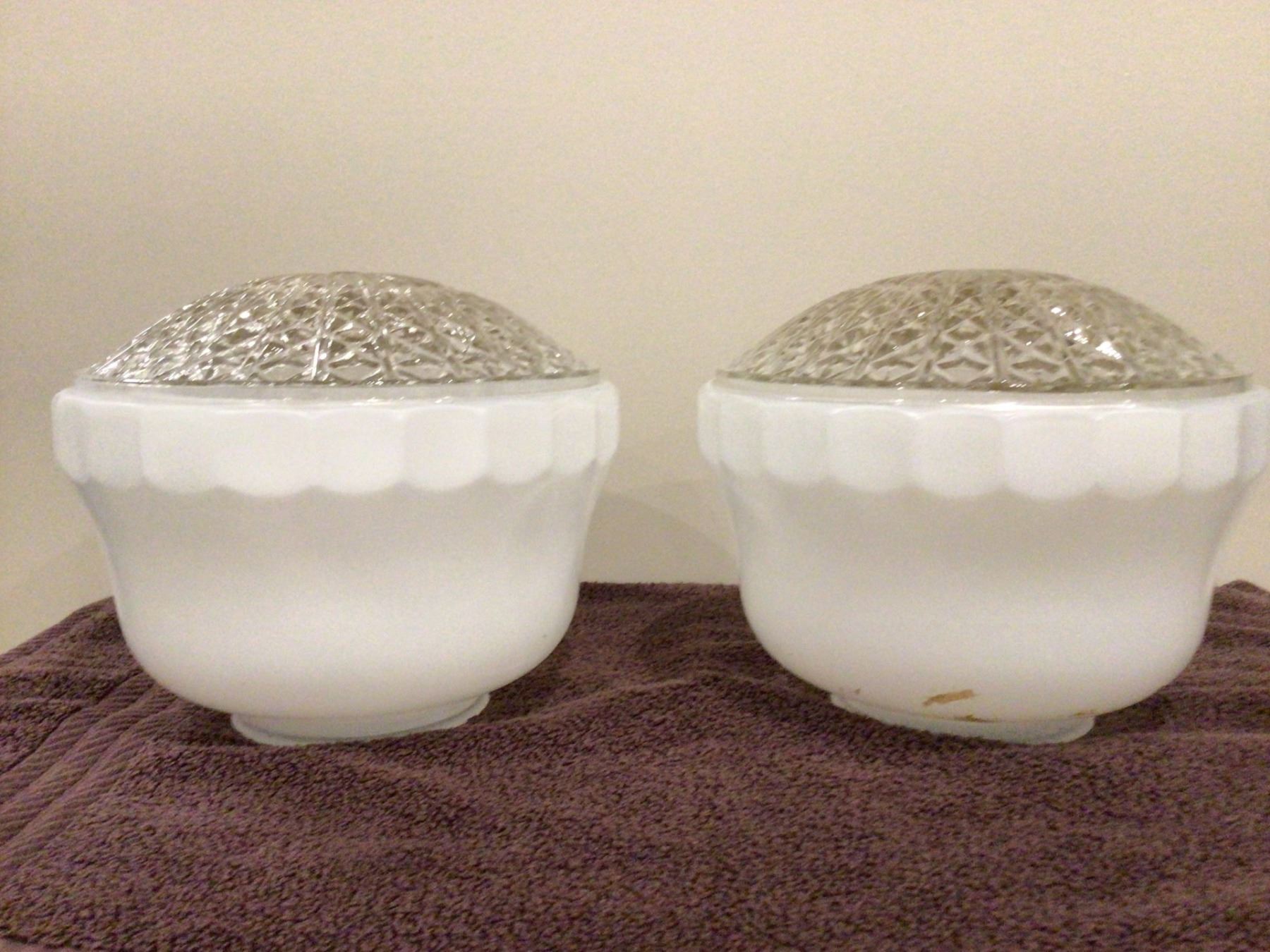 2 Vintage Art Deco MCM milkglass and clear ceiling light globe shade. 6 1/2" tall, 7 3/4" wide. In great condition - no chips or cracks.