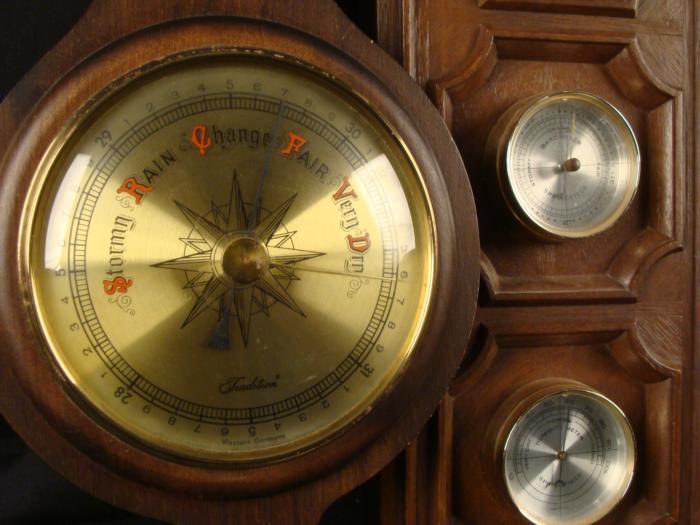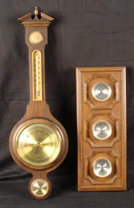Here are two vintage barometers, both with a distinct style, and both in very good condition, with good accuracy. The banjo style is a Tradition brand, made in West Germany. It features a wood body with nice gold tone face with antique style lettering. The round part on top has some wear. Its size is 9" x 29". The other is a Springfield made in the U.S.A. It is plastic wood grain, and measures 8" x 19."