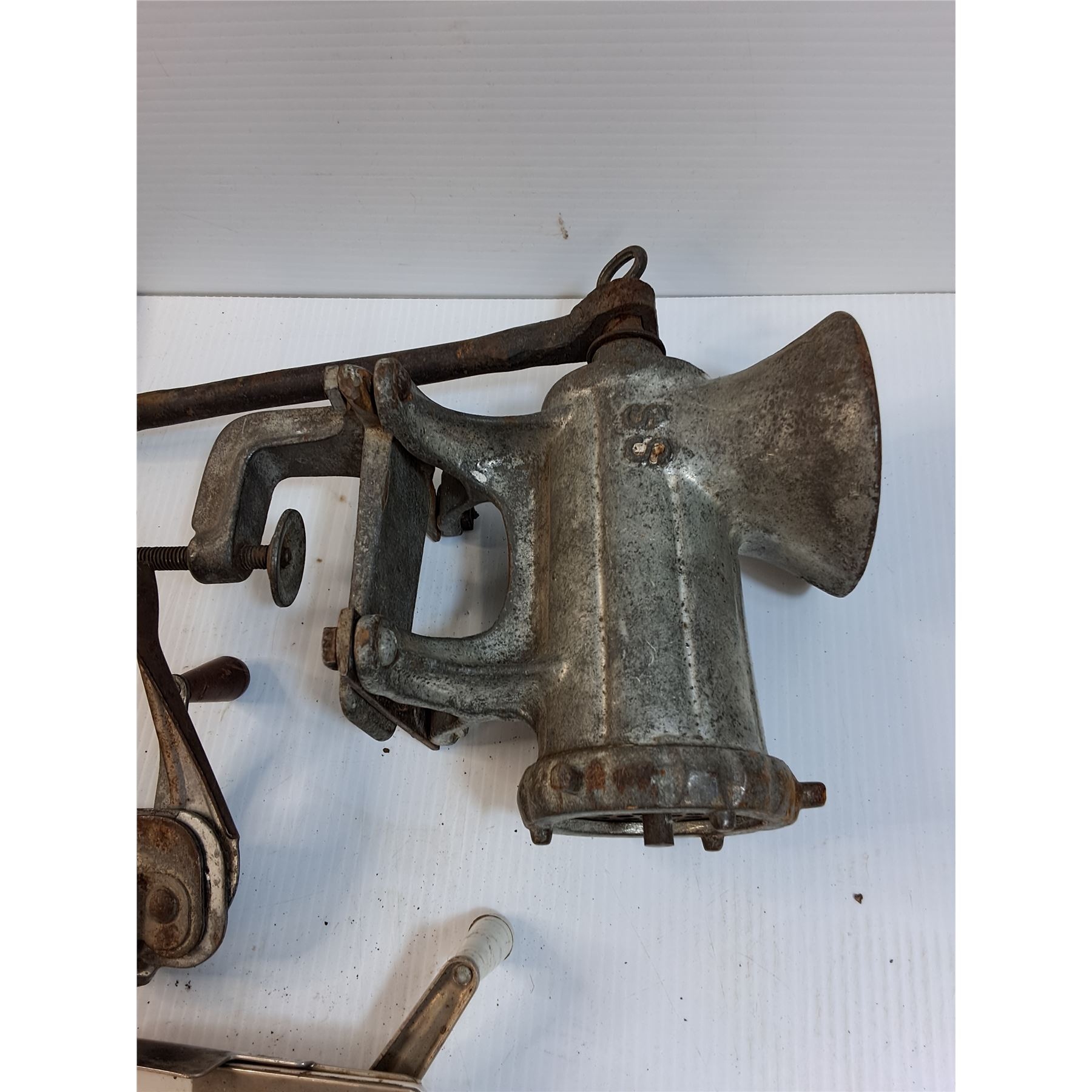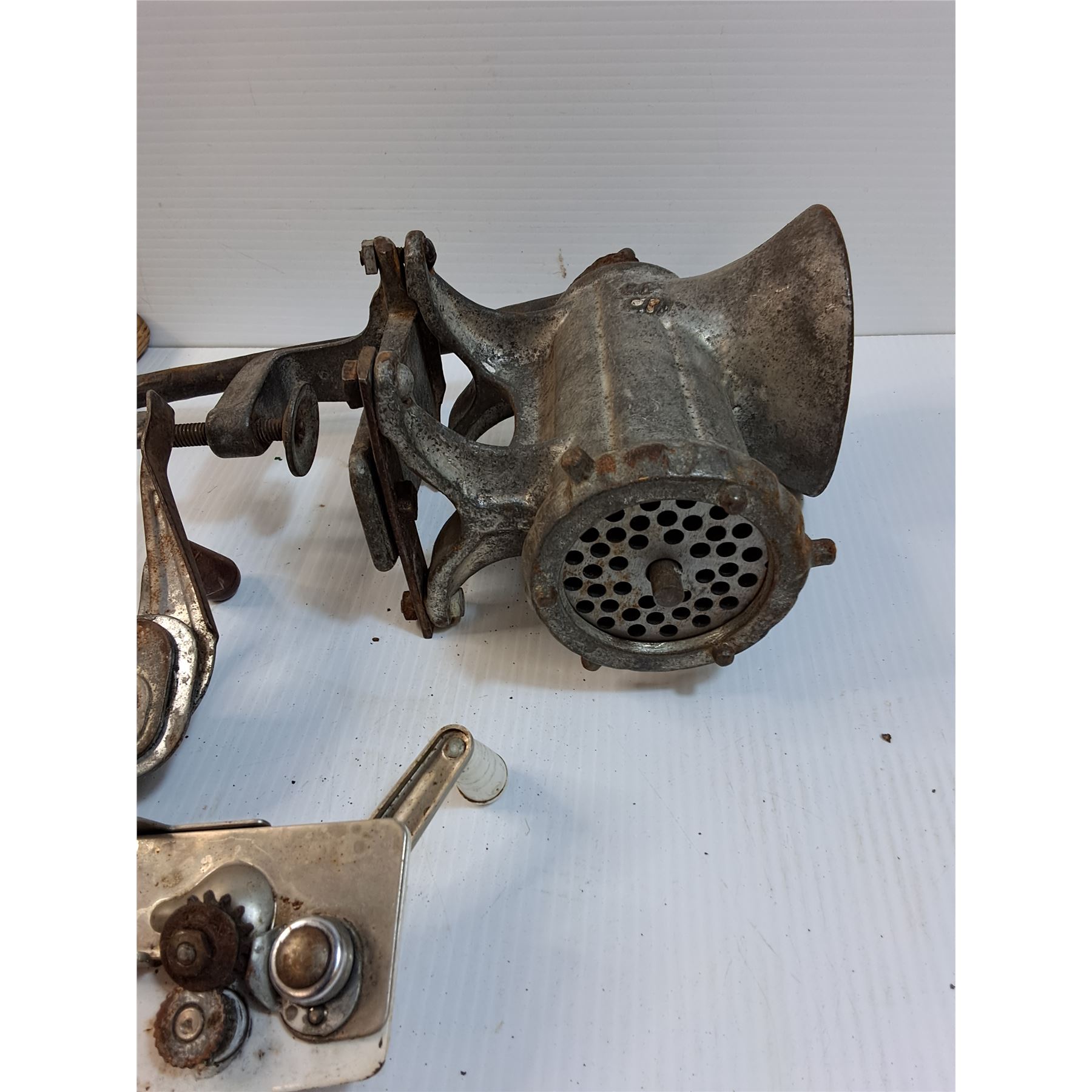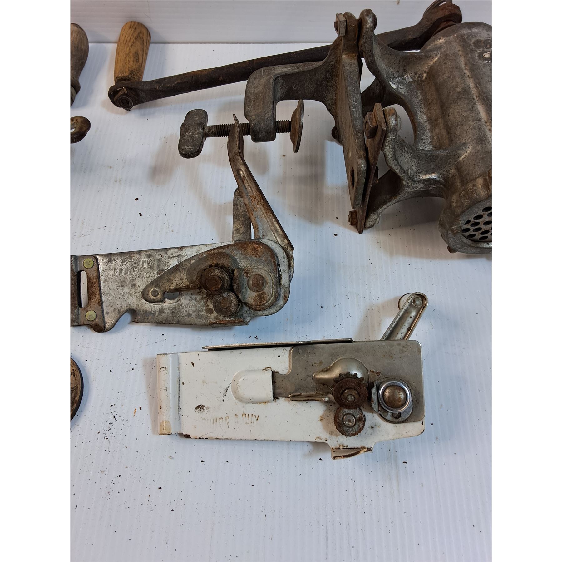 (2) Vintage Bench Mount Meat Grinders (Manual) & (2) Vintage Can Openers
