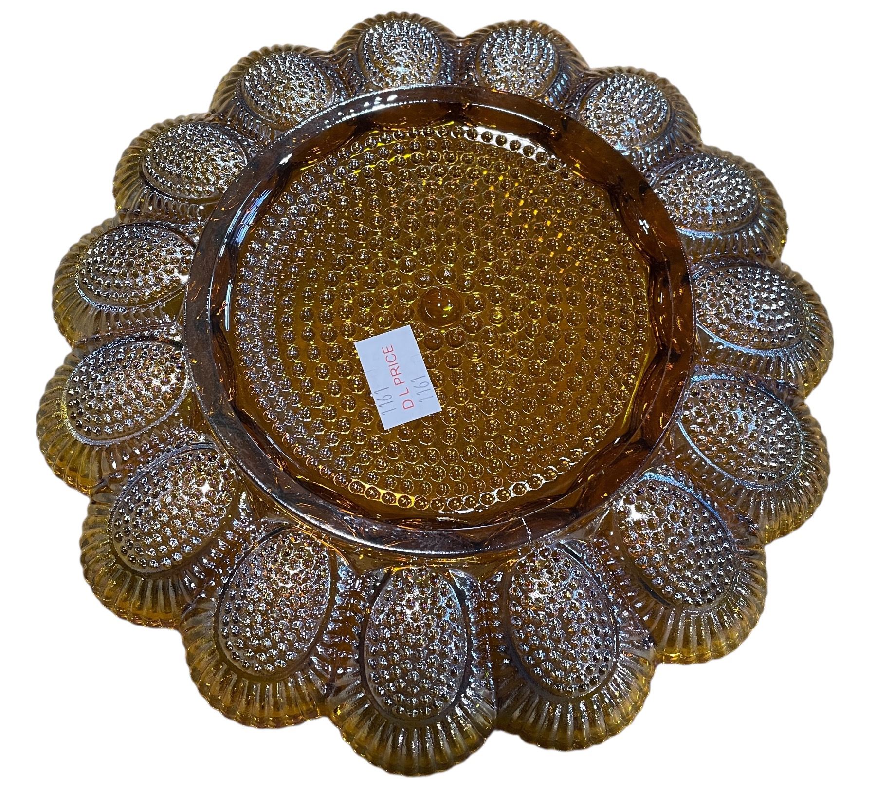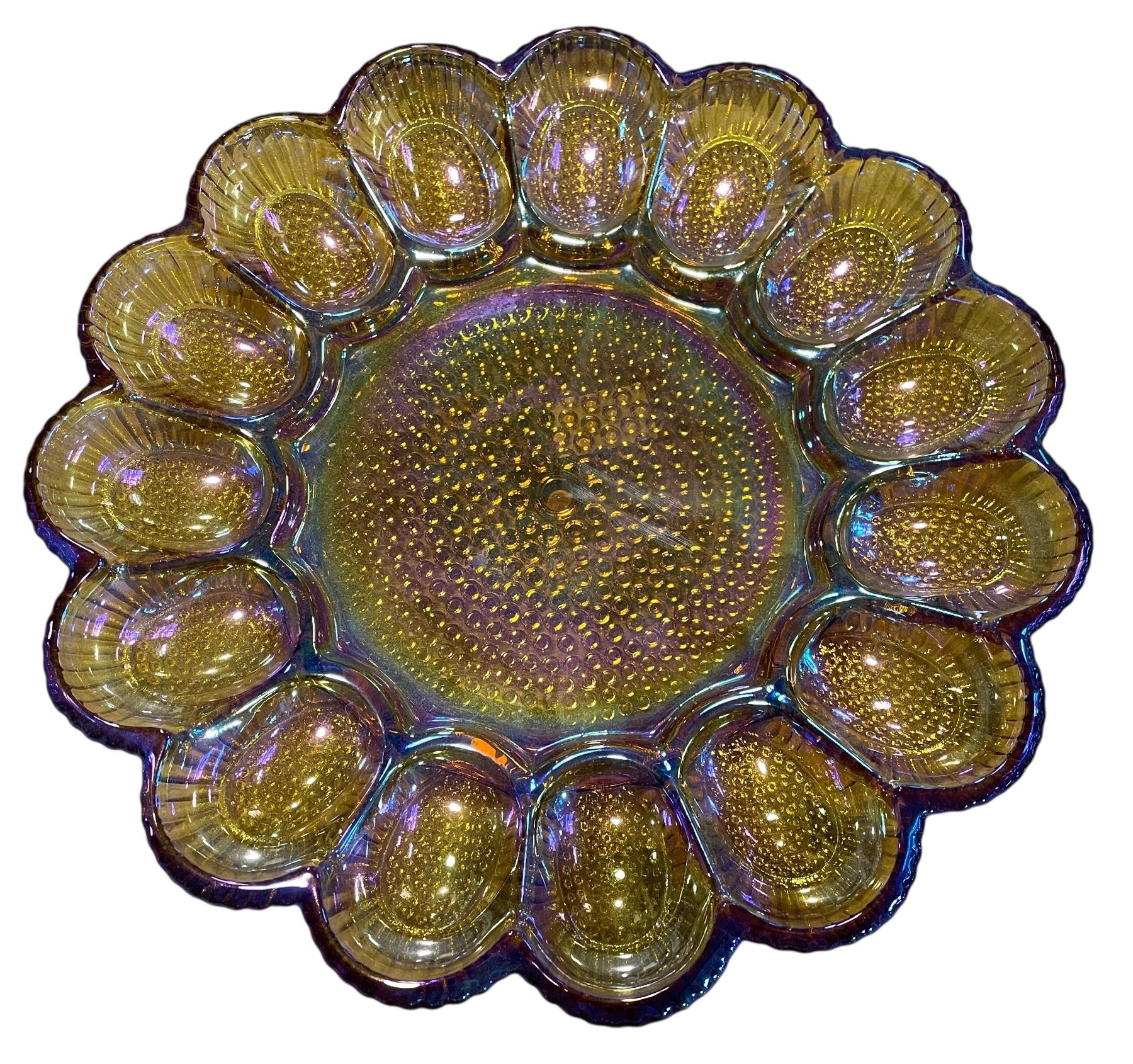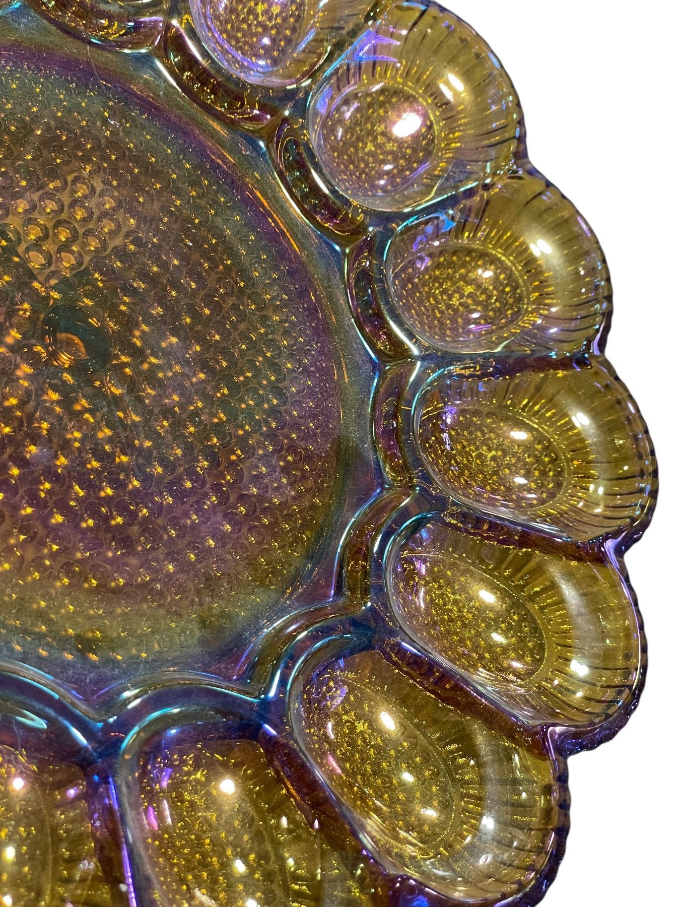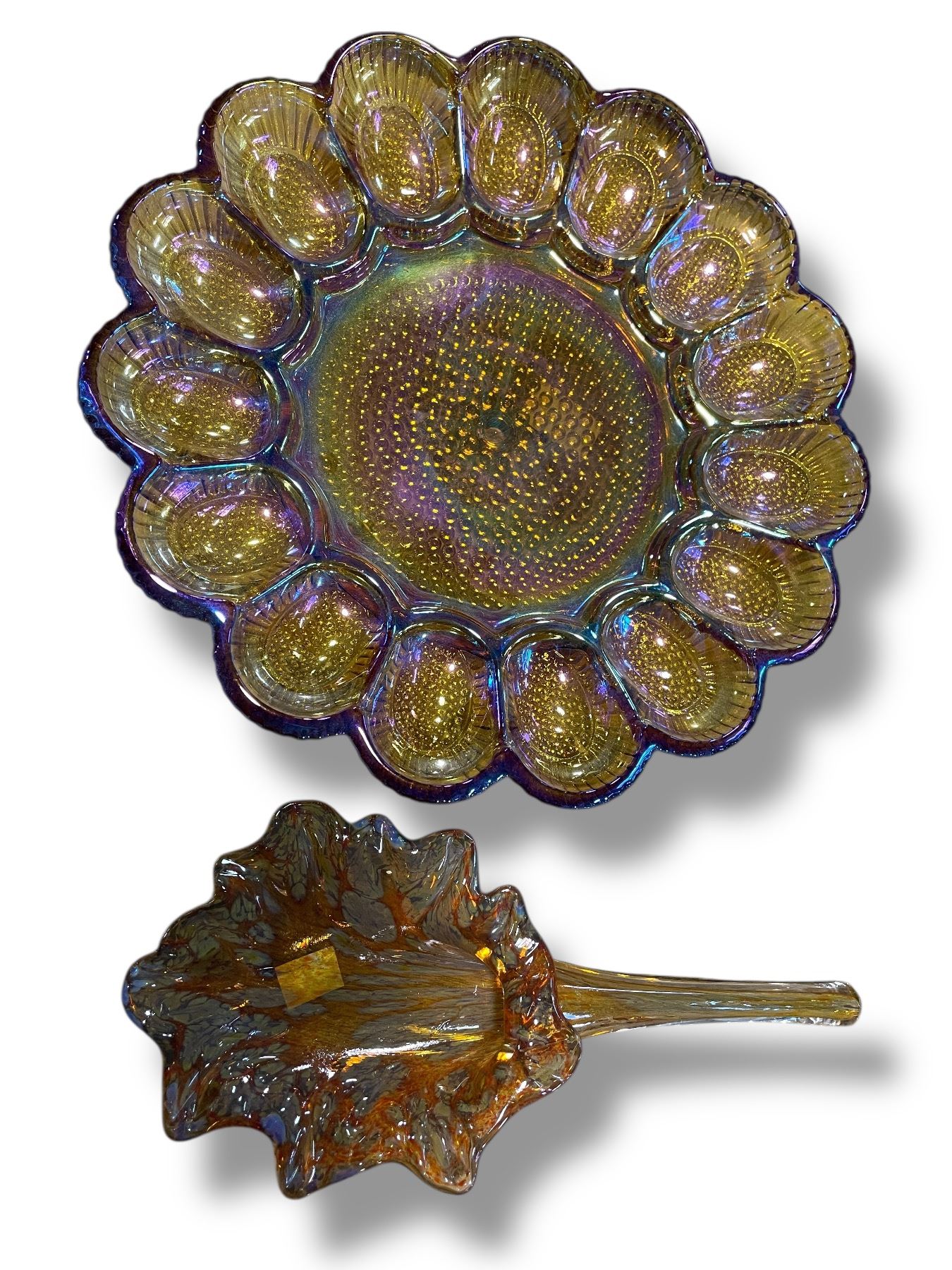 2 Vintage Carnival Glass Pieces – Iridescent 12" Deviled Egg Serving Tray & Hand Blown Glass Art