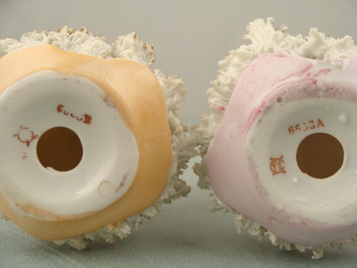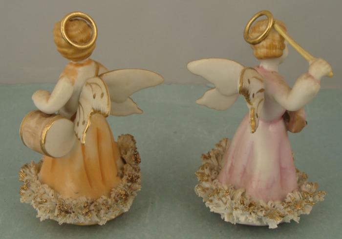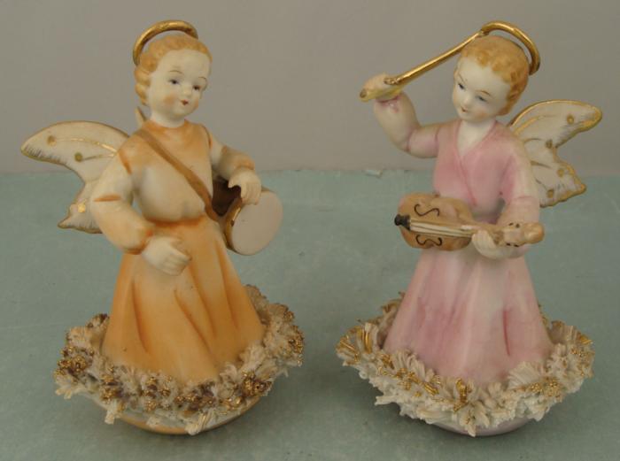 These two angel figurines look like they're ready to play a joyful song, one with a violin and one with a drum. These are 5" ceramic figurines, with delicate features, hand painted with gold highlights, and surrounded by lush flowers. Each has a stamp on the underside, which might be from a Czech maker, and they date back over 50 years. * These angels will lovely for the holiday, or to keep you company all year round.
