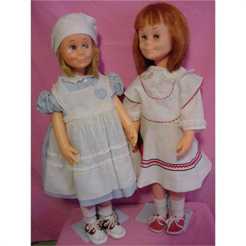 2 Vintage Charmin Chatty by Mattel. Two sweet 25in dolls made of all jointed vinyl. They have sleep eyes, one blonde and one redhead, with rosy complexions and pouty lips. They are dressed in vintage dresses and shoes that look well on them. They are from 1961 and they talked but now they do not. Still quite charming, this pair!
