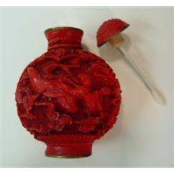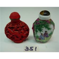 Lot of 2 China vintage snuff bottles. One is cinnabar red with brass fittings other is hand painted porcelain with tiger-eye stopper. Both are 2 1/2" with spoons intact.