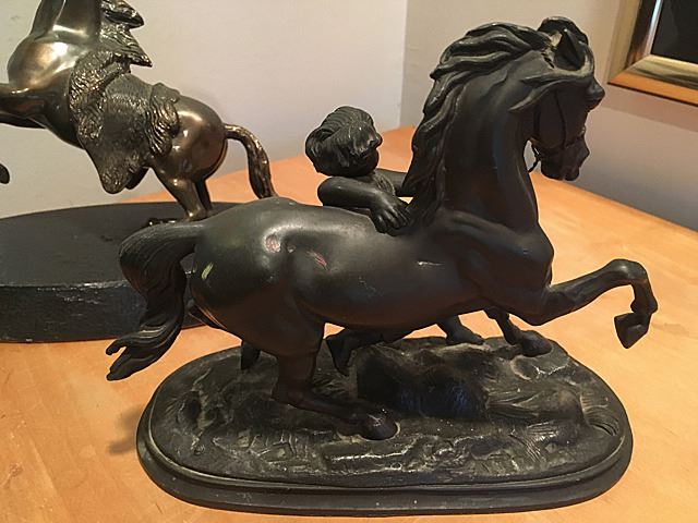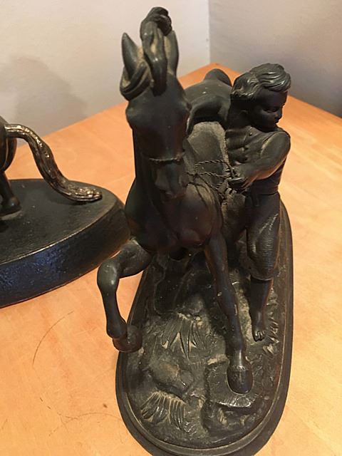 2 vintage clock statues of horses, one is spelter with horse and young boy, the other is a classic rearing horse, both measure approx. 7" tall x 9" wide.