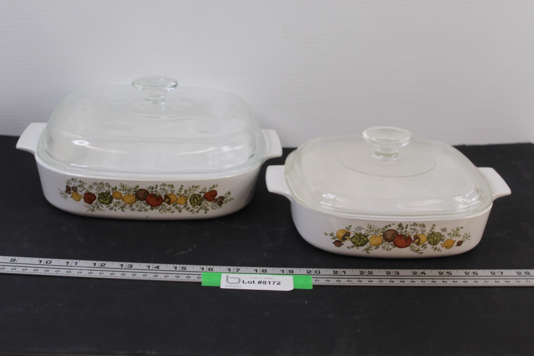(2) Vintage Corningware Dishes w/Glass Lids - 9 3/4" & 8" (Small Glass Lid has Chip as Pictured)